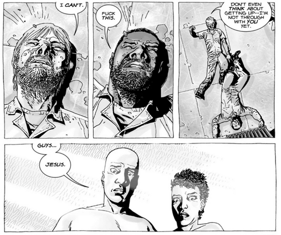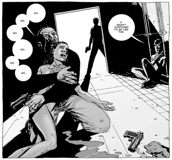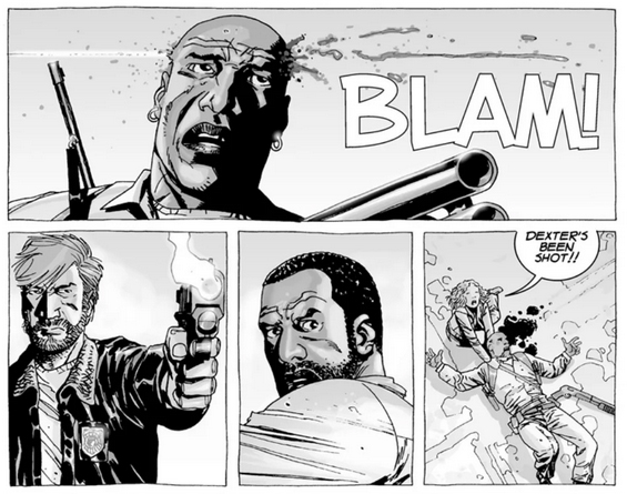 Nothing too bad. I still didn’t care about Allen, who here is bitten on the leg and quickly amputated like Hershel was in the TV show except Allen doesn’t survive here. Didn’t really care, honestly. I just never connected with the character. Speaking of which there’s Patricia and Otis, a couple who were living with Hershel and his family who also move to the prison. It’s the same Patricia who goes crazy and tries to let Thomas out and nearly dies for it, then agrees to team with Dexter during his coup. Otis breaks things up with her because of these acts as well as for hanging out with a “n****r” which is always pleasant to read. I’m very much looking forward to both of them dying soon.