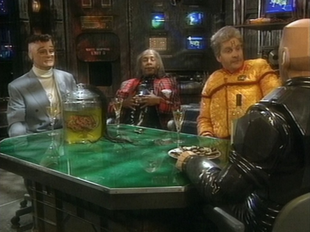 The other two episodes that I think standout even among the rest of Series VI are “Legion” and “Emohawk: Polymorph II”. Legion sees our lead quartet arrive at a space station where everyone is long dead (given they’re over three million years into history, not a big shocker…) but soon a person in a mask appears and begin to show them around and help his new guests by removing Lister’s inflamed appendix then and there and giving Rimmer a “Hard Light” hologram projection which allows him to actually touch objects and people and even taste. Legion wishes for them to stay and gives them each their ideal rooms but everyone, for some reason, wants to head back off in a small green spacecraft looking for their ran-down old ship instead and it’s here Legion reveals his secret: he is a gestalt entity, he only comes into existence when other lifeforms are on his space station, becoming a mix of all those on board. This meant in the past he was a creation of some of the greatest minds in the galaxy who stayed there, but now was instead a combination of our four leads. Kryten figures out a plan that involves rendering everyone unconscious apart from himself, meaning Legion only had Kryten’s mind and therefore was unable to refuse to help. Lot’s of great moments, especially some more slapstick violence than normal for a Red Dwarf episode, but it worked.