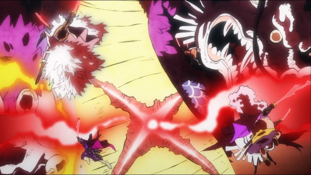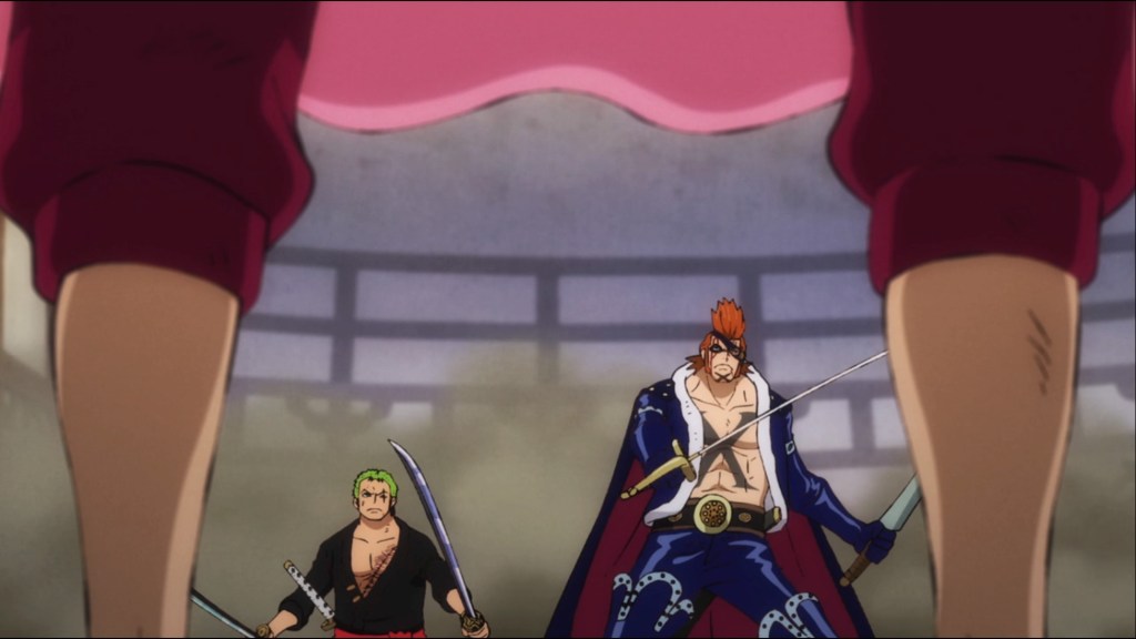 The alliance of pirates and Samurai arrive at Onigashima and infiltrate Kaido and Orochi’s party, ready to finally take out the big man, though doing so may not be as easy as they first thought (and they already didn’t think it would be easy) as Big Mom has also arrived at the castle…