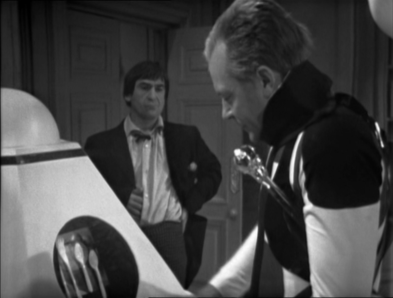 The Doctor remains unconvinced of Clent’s computer / holder of plastic utensils.