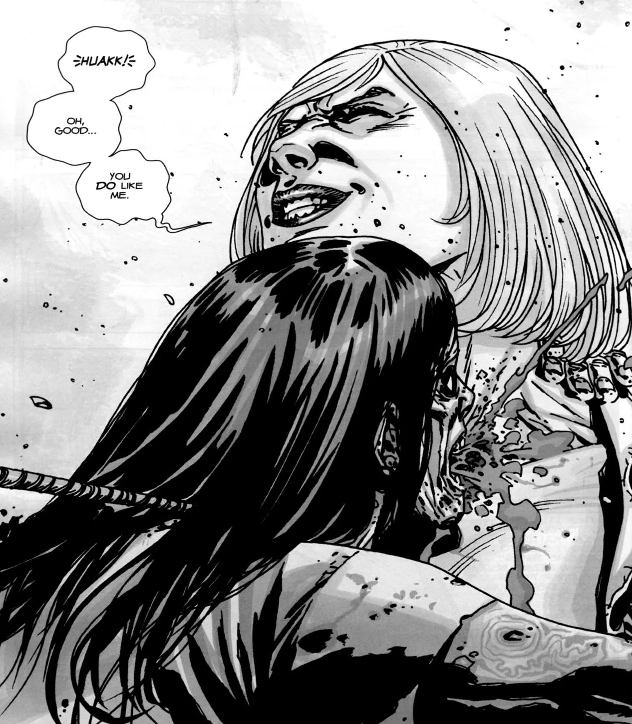 In terms of building a false sense of security you have to hand it to Volume 7. After surviving all the horror at Woodbury everyone starts off on edge about a possible counterattack but it doesn’t really happen. Tyreese, Andrea, Glenn, Maggie, Michonne and Axel all head off to find the guard station that was mentioned by the Governor and successfully capture a bunch of equipment and a large truck (then blow it up for good measure) and on the way back they encounter some of Woodbury’s men at a shop while grabbing some food and end up killing them in a firefight, but again, no immediate reprisal. Glenn and Maggie get married, Lori successfully gives birth to little baby Judith, really the only things that go wrong are Dale being bitten on the leg and ends up getting it amputated and Carol finally loses the plot and intentionally gets her neck bitten by a zombie they had stringed up. So there goes the original Carol, it’s certainly funny how much the two characters diverged between TV and comic there! The peace all comes crashing down in an amazing series of panels as while laughing together Herschel and Rick slowly drop their jaws and say “oh fuck!” as they spot a huge convoy of vehicles and a tank heading their way, the now one eyed and one armed Governor poking out of the top of the tank giving orders to fire. That’s how Vol. 7 ends! Perfect writing the whole way through, that’s how you build up a big event!