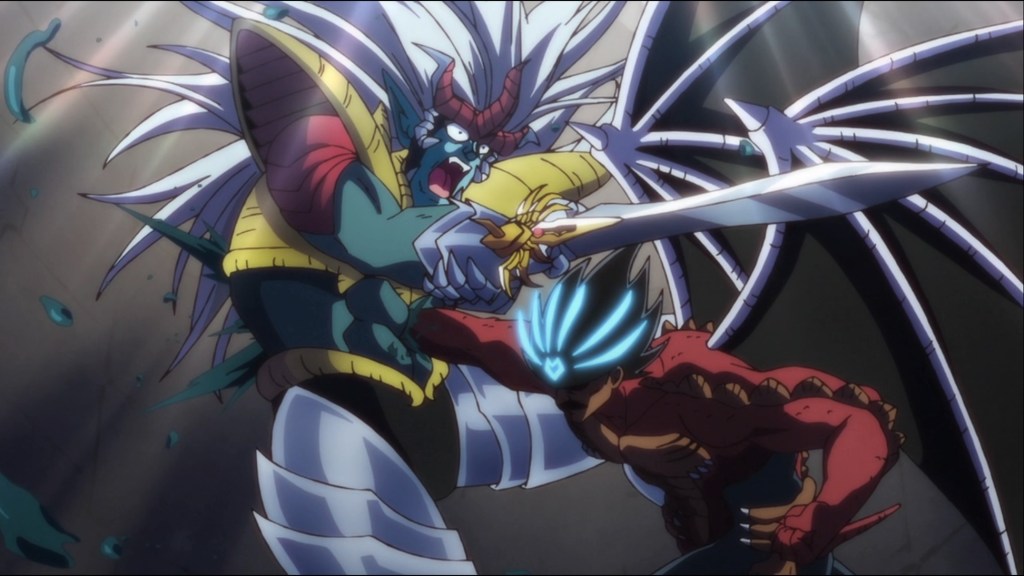 We kick these episodes off with the heroic party deciding to finally assault Vearn Palace and attack the head honcho himself. Dai’s daddy Baran agrees to join forces with his estranged son because he finds out that Vearn wishes to wipe out the entire world and replace it with his evil underworld instead of conquering and ruling over the populace as he’d been led to believe. As some of the side-characters like Hyunckel, Popp and Maam fight the shiny Royal Guard Dai and Baran break into the palace and square off with Hadlar and his new powerful body. Despite Dai and Baran being more than capable of defeating him they find out that inside Hadlar is a “Black Core” bomb that would annihilate the entire area if damaged. Hadlar is unaware of this and when he does find out he despairs as all he wanted was a fair fight against Dai before his new super-body gives out.