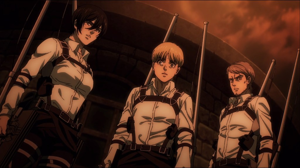 I don’t want to spend all day here, but the key thing is that after Eren and the Wall Titans march off we see Armin, Mikasa, Jean and Connie agree to chase after Eren and stop him, as no matter how you slice it “genocide is wrong”. They soon meet up with Annie, who after all this time frozen in Titan crystal… stuff finally became unthawed due to the Rumbling, and soon joins with them. They’re also joined by surviving Marlians including Reiner, as well as Hange and Levi. The final few episodes sees them assaulting a port full of their own friends and allies who have sided with Eren and tearfully having to kill them before heading off to the final confrontation.