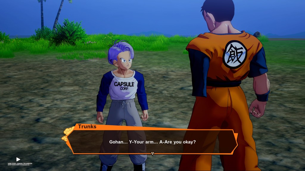 This game is, I believe, the first one ever to feature Future Gohan without his left arm. Also, what kind of question is that, Trunks?! What do you think his response is going to be?!