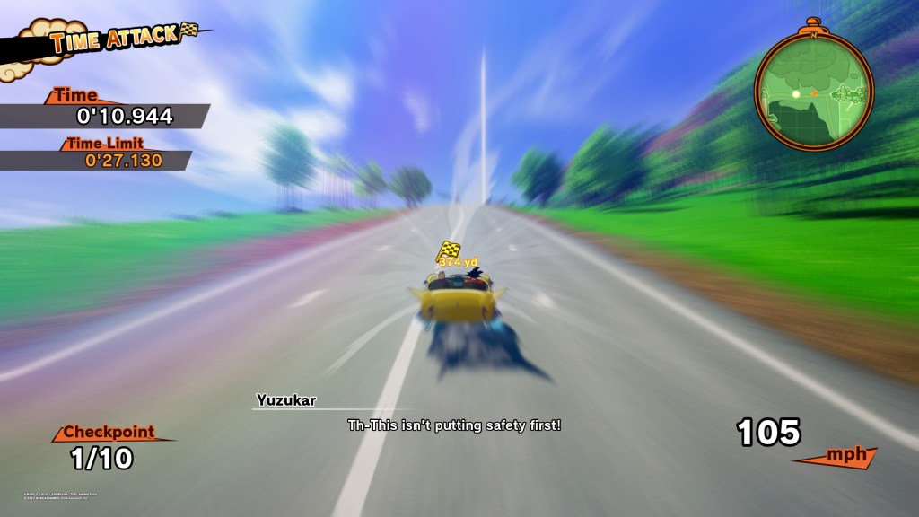 So uninteresting combat aside, what about the open world? Well that at least is extremely fun and even after all those hours the joy of flying up into the air and soring around as Toriyama-style cities and dinosaurs come into view underneath you never got old and was frankly the only thing keeping me going (that and sense that I hate leaving things half finished once I’ve started them…) You have all the hallmarks of open world games present: side quests (which nine times out of ten involve fighting the f**king pirate guardian robot from Dragon Ball AGAIN), collectables (including far too many floating orbs all over the place), shops, cooking meals to get buffs, fishing, collecting machine parts to build vehicles you’ll never use because flying is far quicker, a driving mini-game based on that classic filler episode from the Cell Arc where Goku and Piccolo have to learn how to drive (yes, really!) and the aforementioned skill tree for your seven playable characters of Goku, Vegeta, Gohan, Piccolo and Future Trunks, plus Gotenks and Vegito who were thrown in post-launch when people complained about only being able to play as them briefly. You can also level up Krillin, Yamcha, Tenshinhan, Chiaotzu, Android 18, Goten and Trunks as they can be set as assist characters that can pop in, do a quick attack and then pop out again during combat.