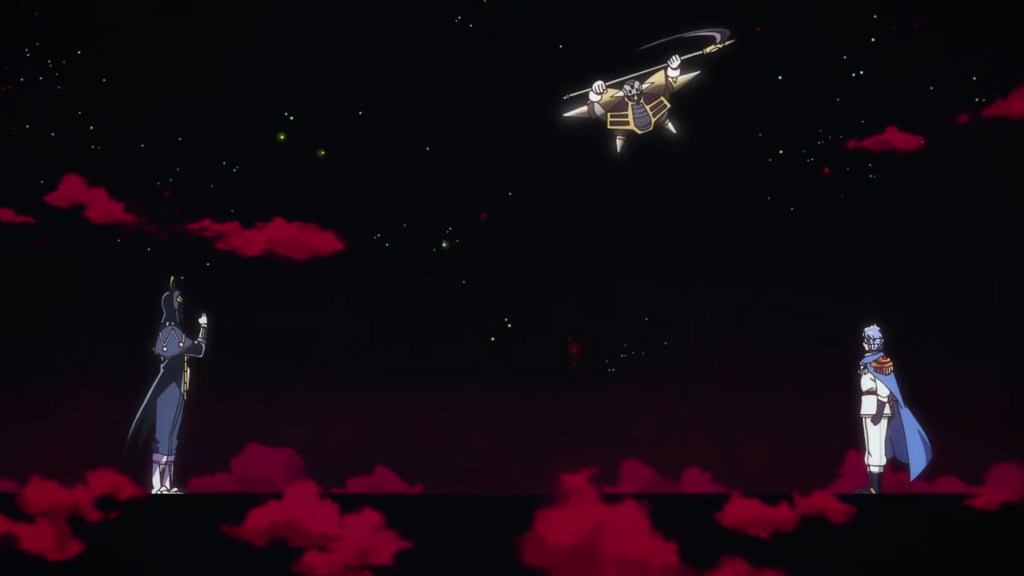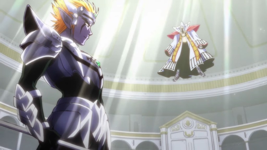 When we last left our Hero Party they had arrived at the palace of the big bad Demon King Vearn but were immediately challenged to a fight by rogue ex-lead villain Hadlar and his “Royal Guard”. The students of Avan all take an opponent, with Maam fighting the “Queen” of the Royal Guard Albinass, Popp fighting the “Knight” Sigma and Hyunckel faces off with “Pawn” Hym, leaving Dai to face Hadlar, obviously. It only takes two episodes for the underling fights to be over as Maam quickly defeated Albinass after they discuss love, Popp takes out his foe with help from Maam allowing them to finally express their feelings for each other, and Hym is just suddenly falling from the edge of the castle going “damn it!” with a hole in his chest, his entire battle off-screen. That was extremely weird given Hym has had the most character development out of the whole guard, but it actually makes sense later!