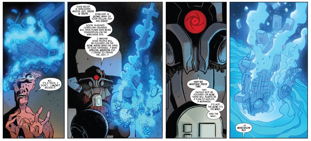 The second issue focuses on Ro torturing a random mushroom-looking Jedi seemingly for the fun of it, going over his plans across the three main books, including a long sequence where he collects the other Nameless creatures from the same planet he got the Leveller from in the second book, but using a bunch of followers to take the brunt of the beating. It ends with him finally breaking the Mushroom Jedi by showing him Starlight Beacon breaking apart and then declaring his ultimate victory…
