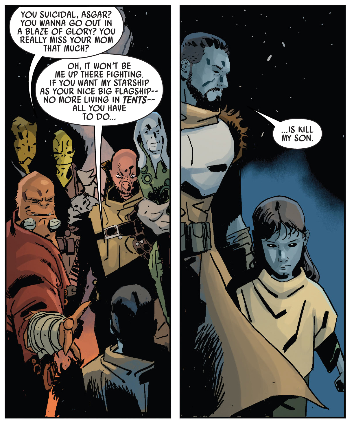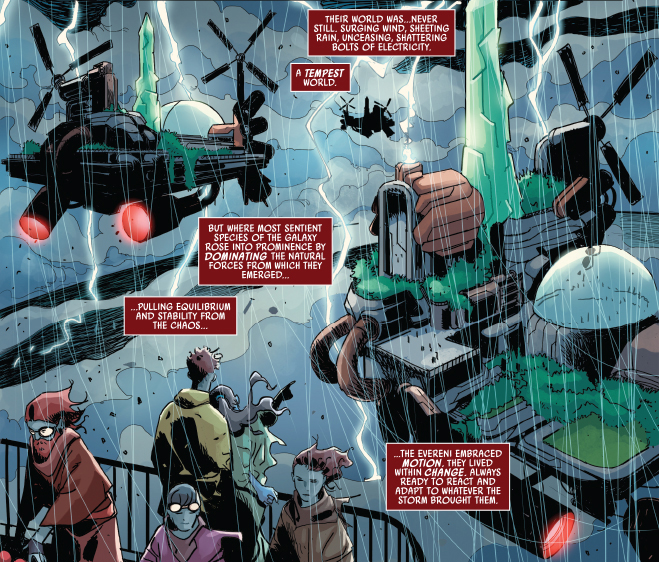The first issue is split in three “acts”, the first of which looks at Ro’s species: the Evereni. They evolved on a hellish planet full of non-stop storms, barely managing to survive on floating platforms until their penchant for treachery got the better of them and they began warring with each other until there we so few left on such an increasingly hostile world that the survivors fled into the wider galaxy, where they then faced near extinction due to soon gaining a bad rep for, you guessed it, constantly betraying others to gain power. It’s a fun backstory and makes the Nihil’s naming convention being based on storm imagery make sense!