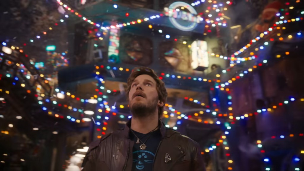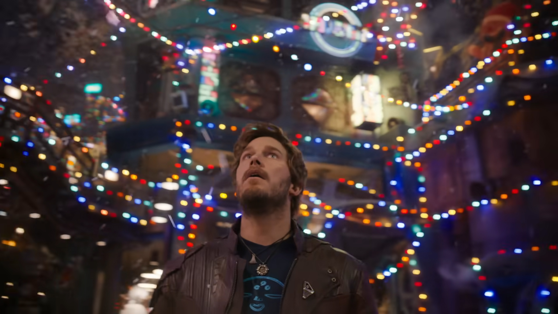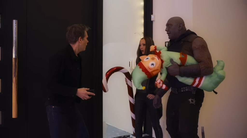 Peter Quill / Star Lord (Chris Pratt) is still bummed out about his love Gamora’s death / alternate timeline version not liking him so Mantis (Pom Klementieff) and Drax (Dave Bautista) decide to do something to cheer him up and hear about the Christmas holiday so put two and two together and come up with the plan to bring Quill’s childhood hero Kevin Bacon to him as a present, still believing him to be an actual hero, so they pop over to Earth and straight up kidnap him, complete with a scene where Drax is amused at some police officer’s attempts to capture him.