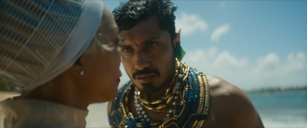 Lead antagonist Namor (Tenoch Huerta Mejia) is vastly different from the comics but this new character at least works well within this film. Instead of being a Greek mutant from the sunken city of Atlantis he is a member of a Mayan settlement that used a magic plant to escape the Spanish and live underwater, though he is at least a mutant with tiny ankle wings, pointy ears and slower aging though, that’s the same across both mediums. However Namor from the comics is arrogant and violently against humanity in order to protect his underwater home but this Namor is more understanding and sympathetic, having a legit reason to distrust the people of the surface world given they were responsible for his mother’s death and enslaving a bunch of his people when he was still an impressionable boy. That being said once the US government detects Vibranium in an ocean trench near his underwater city of Talokan Namor attacks them and prepares his people for a war against the entire planet, so… he’s not lacking in confidence at least! He bonds with Shuri and wishes for Wakanda to join forces with him, but when they refuse he makes them his first target. I can’t say Tenoch has much of a commanding presence about him either, which helps with the more sympathetic part but not the would-be world conqueror part.