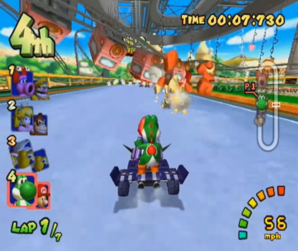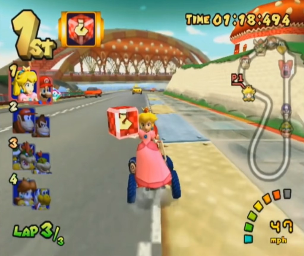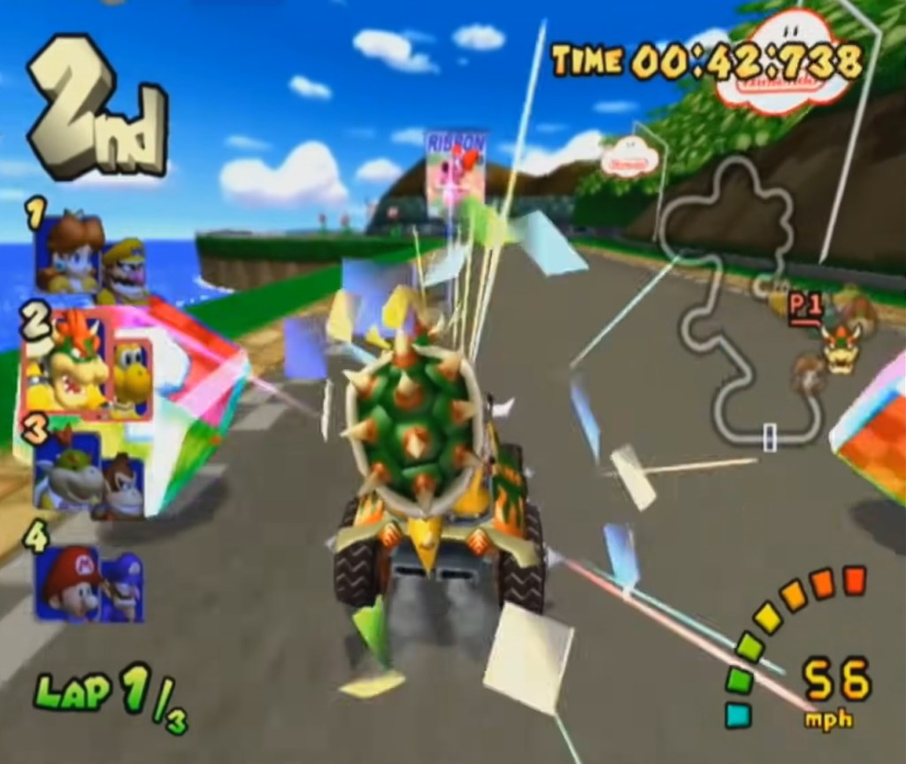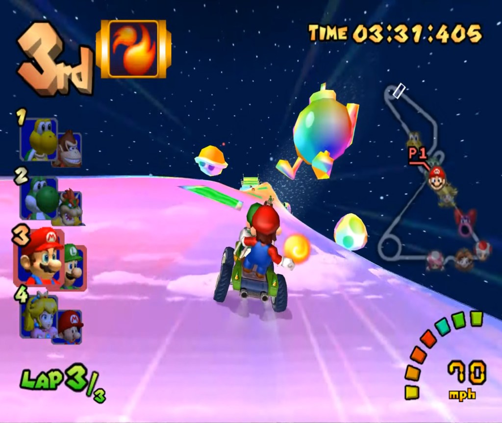 Double Dash’s Rainbow Road doesn’t really stand out design-wise, but was still fun and challenging, unlike MK8’s Rainbow Road, which is neither.
