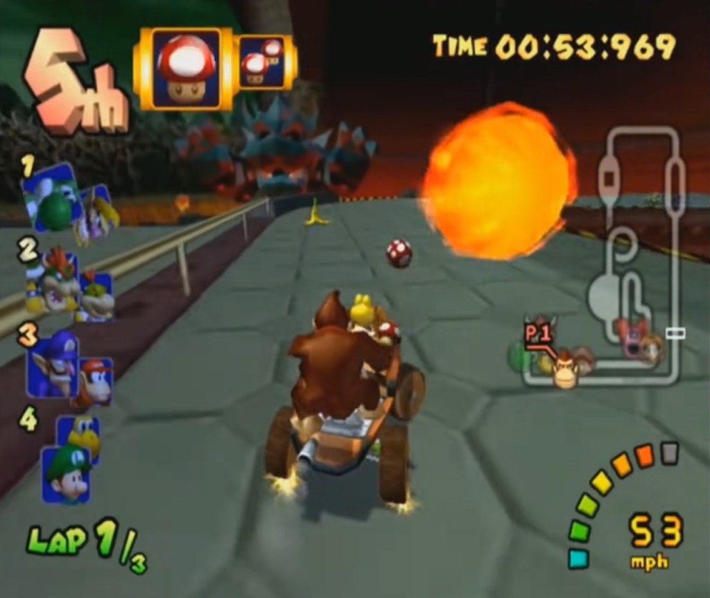 The basics are still the same: race around a track trying to come first with the ability to pick up weapons and use them on your opponents along the way. The key differences in weapons is that you get two weapons at a time (one for each racer) and you can swap racers with the push of a button which means you can also swap between your two stored weapons freely, and each pair of racers have their own unique weapons: Mario and Luigi have fireballs, the Kongs can drops giant banana peels, the Bowsers can fire huge bowser shells, Wario and Waluigi can toss bob-ombs, the Toads have a golden mushroom that can give them a boost multiple times, the Babies have the Chain Chomp that can pull them forward and attack racers in front of them, that sort of thing. A lot of these character-specific weapons return in later games as just regular ones.