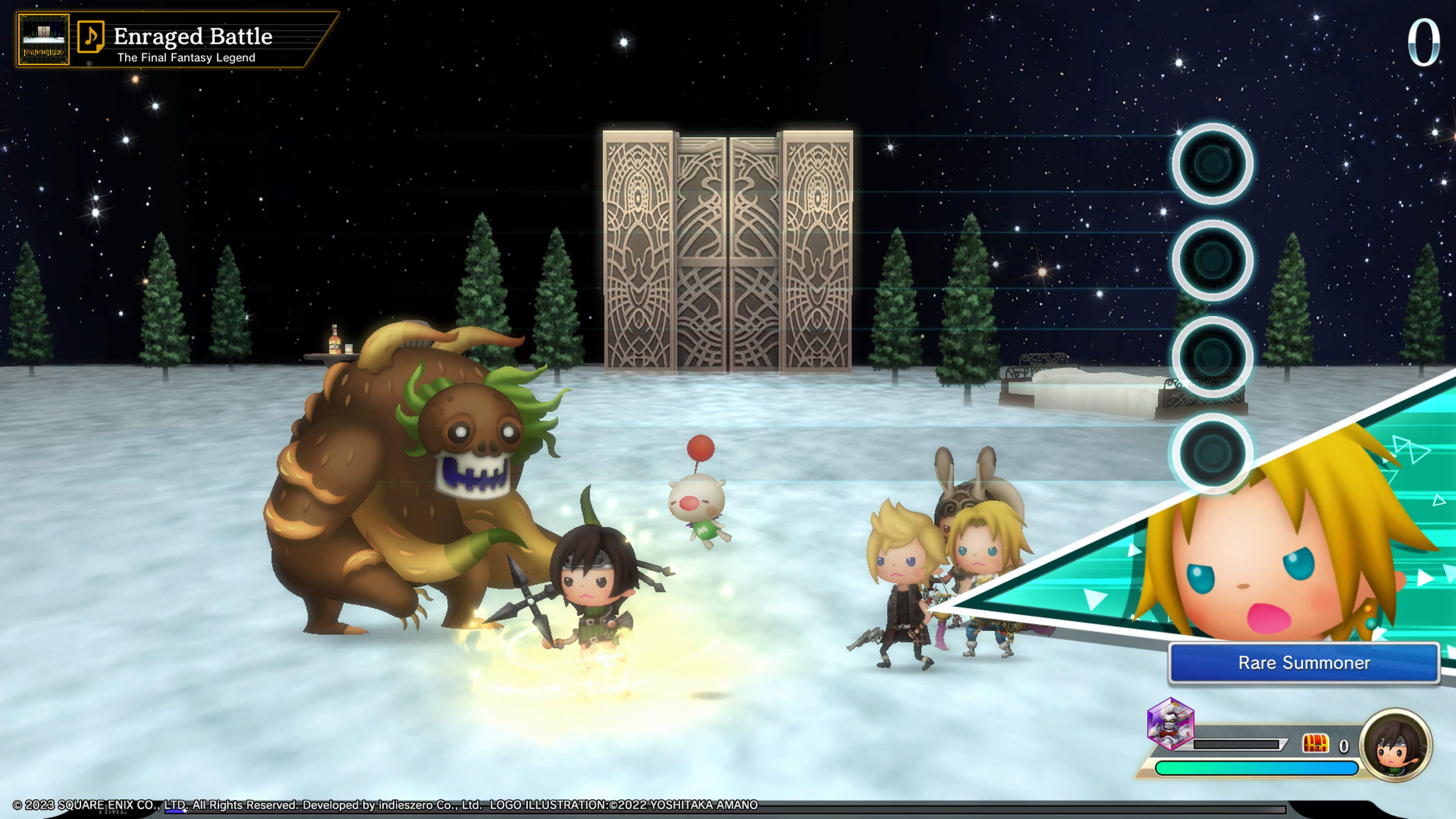 While that’s the main crux of the gameplay there are light RPG elements as you unlock characters as you go and they level up, as they level up they unlock moves and abilities. You see as you play the music sheet at the top of the screen at the bottom your chosen party battle monsters and bosses, gaining experience, items and “CollectaCards”. They do damage based on their stats and their moves, plus your timing also doing damage to enemies depending on how good you do (as it’s rated from rainbow critical, regular critical, great, good, bad and miss). You can also unlock summons which not only do damage when their gauge fills but they can have stat-boosting abilities as well, plus different airships and outfits for your Moogle, though both of those are purely cosmetic.