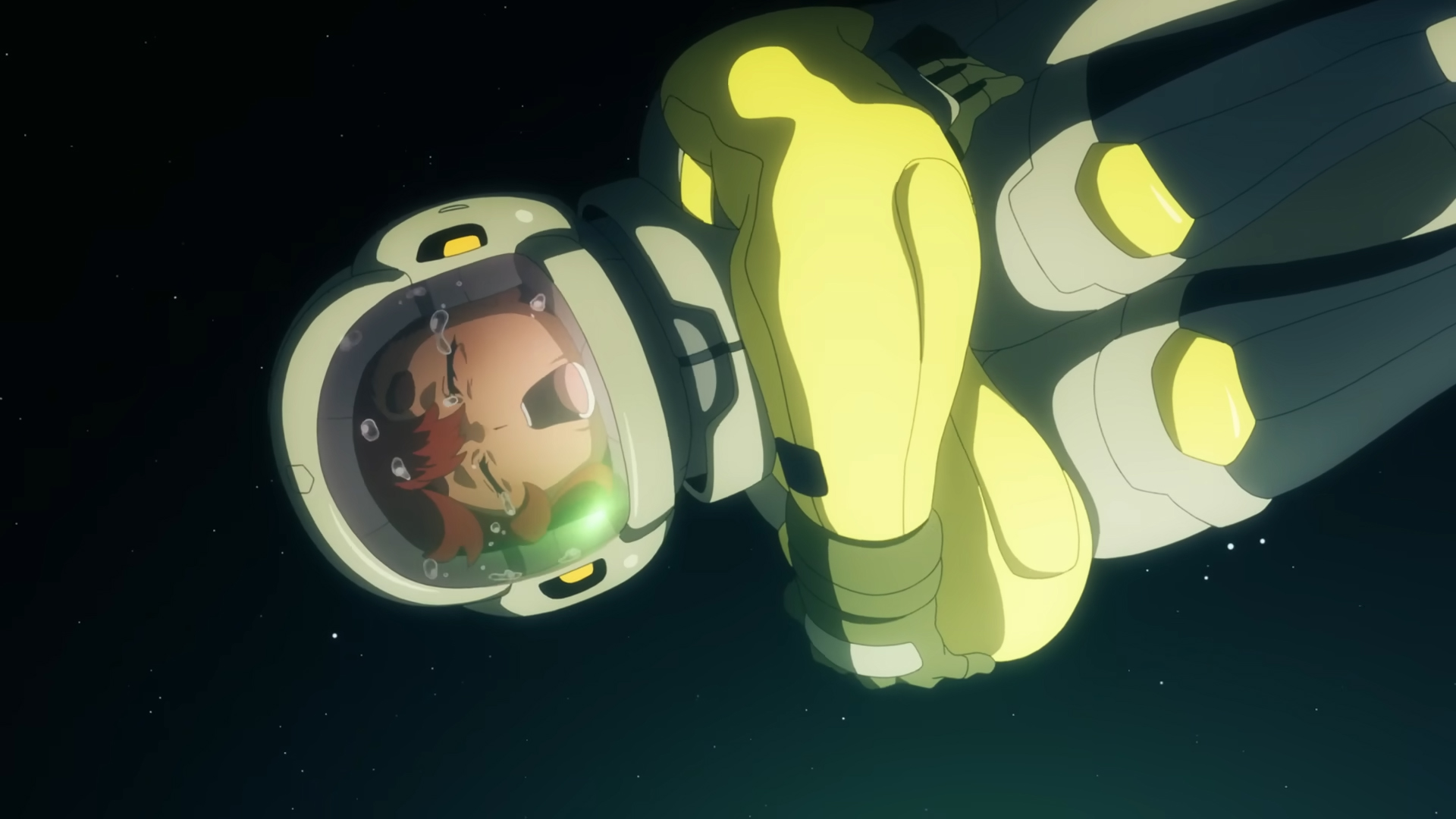 This all sets up the major mid-way act as Shaddiq puts his plans into motion to take over the whole Benerit Group and transfer their assets to Earth, therefore evening up both sides and hopefully ending the hatred between “Earhtians” and “Spacians” (so as far as villainous plans go, that’s not a bad reason for one!). Meanwhile Suletta is removed from the political equation by Miorine and Guel, who cruelly take her title of Holder and generally tell he they’re no longer friends in hopes she doesn’t get involved, then a short while later Suletta is told by Eri of her origin as a clone and that she can now control Aerial by herself so she is no longer needed. Prospera arrives to confirm everything and tells Suletta she won’t be needed any more and leaves her drifting in space, crying because literally everyone she’d ever cared about had just abandoned her, even Aerial. It was legitimately heartbreaking, certainly made up for any feelings of distrust from the whole “I’ll do whatever my mum tells me” part. Shaddiq’s plans cause the outbreak of war on Earth (just as Miorine and Guel arrive, making them look complicit) and similarly mobile suit fighting breaks out at the school as well, leaving many school kids dead and sending Miorine spiralling into a guilt-fuelled depression. Suletta sees the destruction and finally starts to make up her own mind about things as she soon starts helping to try and free several of her trapped schoolmates and later helps handing out food and the like. This also reunites her with Earth House and they form a tightknit unit once again.