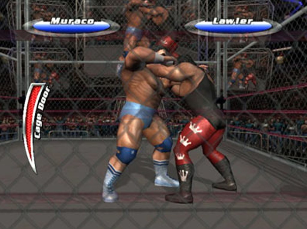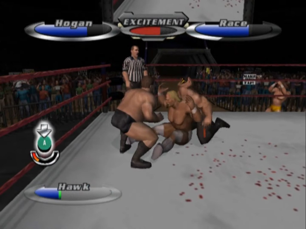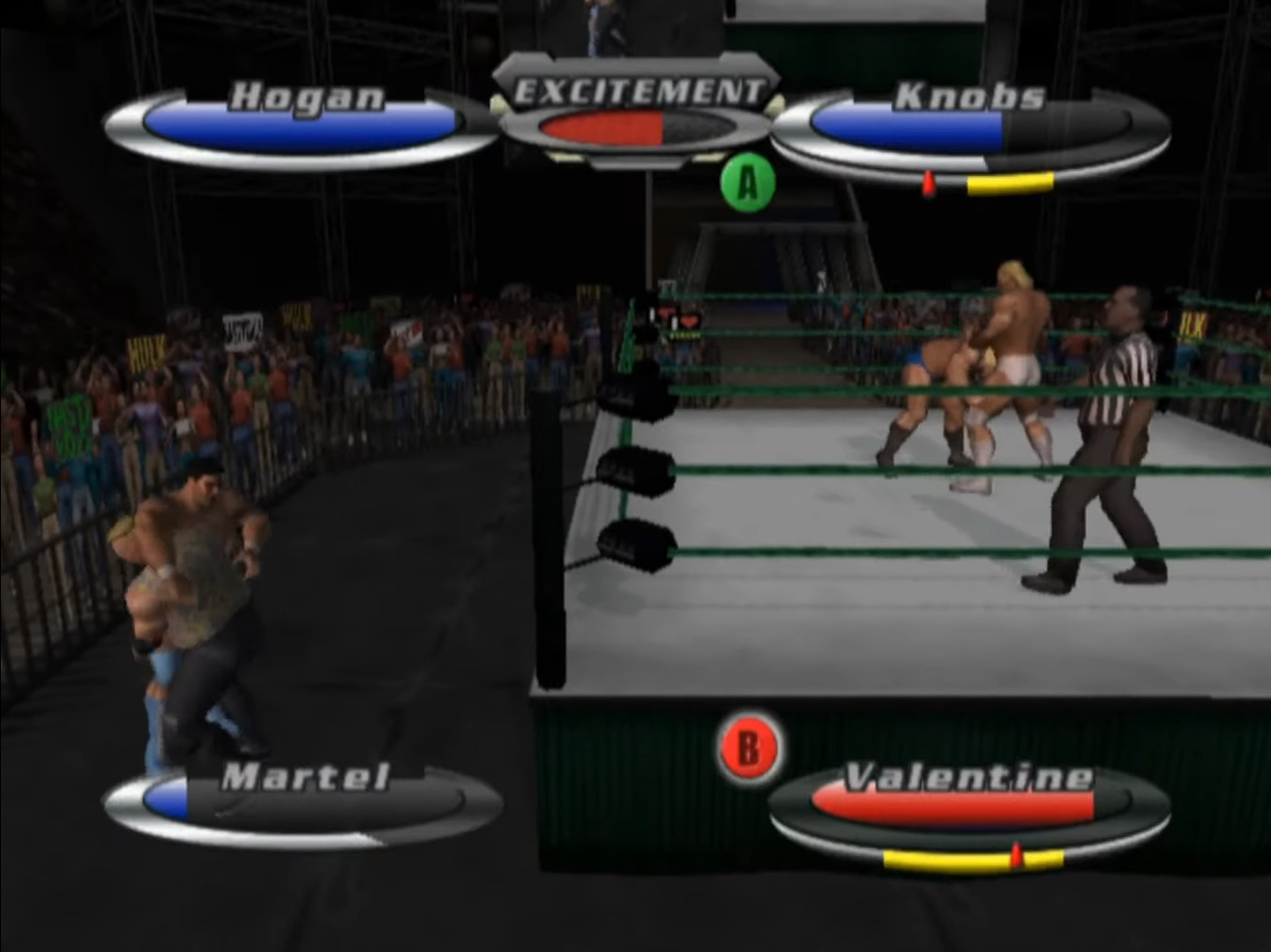 Not a lot has changed between this game and its predecessor, just lots of things got added to and more polished. The gameplay is the same: you can strike and grapple and each time you do one or the other your opponent (or you if the situation is reversed!) has the ability to reverse it by observing a golf game-like swing-o-meter at the bottom of your health bar, hit the button press when the triangle is over a highlighted area and your reverse the move. Likewise if your doing the move your can win your own swing-o-meter game to chain the move into another, allowing a hiptoss into a chinlock, or a slam straight into a pin. Nothing too fancy but the combination of the chain wrestling and reversing does lead to quite a fun gameplay engine, though sadly a lot of the actual animations are quite stiff looking, and its one of those games where nearby wrestlers can get knocked down if they’re too close to a move being done, which sometimes works well but most of the time just looks silly. There are also ground moves, submissions, running attacks, top rope moves and weapons to use when you’re outside the ring, so all the usual stuff. Your health bar drains and goes from green to red to empty and each level your stunned for longer and your swing-o-meter button press window is smaller. It’s a fun system once you get into the swing of things (no pun intended, actually no pun intended but yet there it is) though it hasn’t dated very well, mostly the previously mentioned stiffness.