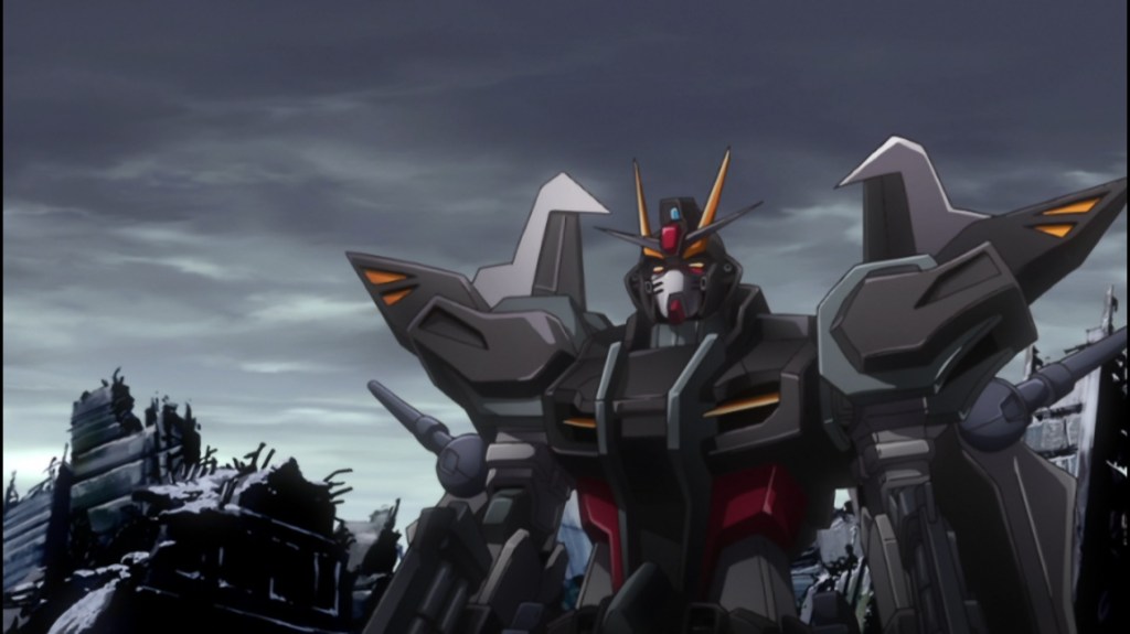On the other side of the war is Sven Cal Bayang, who grew up on Earth dreaming of the stars but was orphaned during a conflict in his home town and ended up in a Blue Cosmos training camp, being indoctrinated to hate Coordinators and view them as inhuman, though unlike his two squad mates Shams and Mudie he doesn’t seem to be as convinced about the whole racism thing. That being said he still slaughters a whole bunch of civilians for no other reason than he was told to, so… he’s not exactly a saint. The three of them form the Phantom Pain unit, with Sven piloting a version of the Strike Gundam called the Strike Noir. After a few missions see Mudie killed he and Shams are redirected to space.