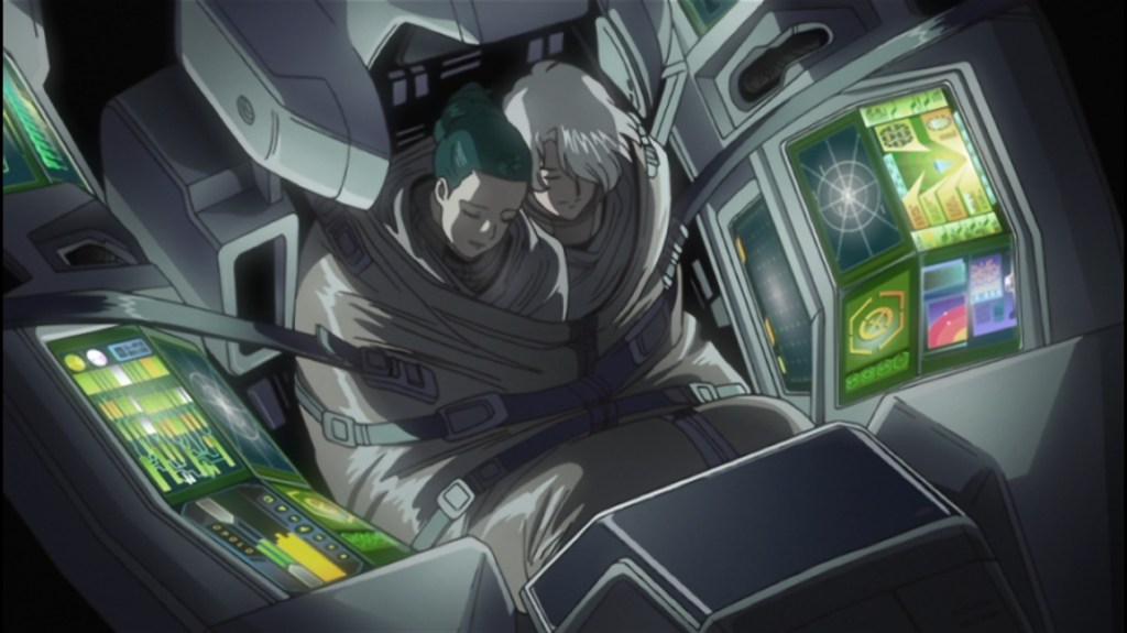 In the final moments then the Stargazer and the Strike Noir are at a stand-still but Selene leaves Sol behind and fights it head on by herself, winning the duel but at the cost of most of Stargazer’s power. Selene flies across to Sven and pulls him out of the Noir and into the Stargazer’s cockpit with her, while tying him up of course. He wakes up and the two have a bit of a chat and see despite being on opposite sides they’re not so different before Selene says they have about 27 days of oxygen left and the odds of them being found are very low, so she puts a blanket over the two of them and puts them into a deep sleep to conserve as much powers and oxygen as she can, Sven no longer complaining about the situation.