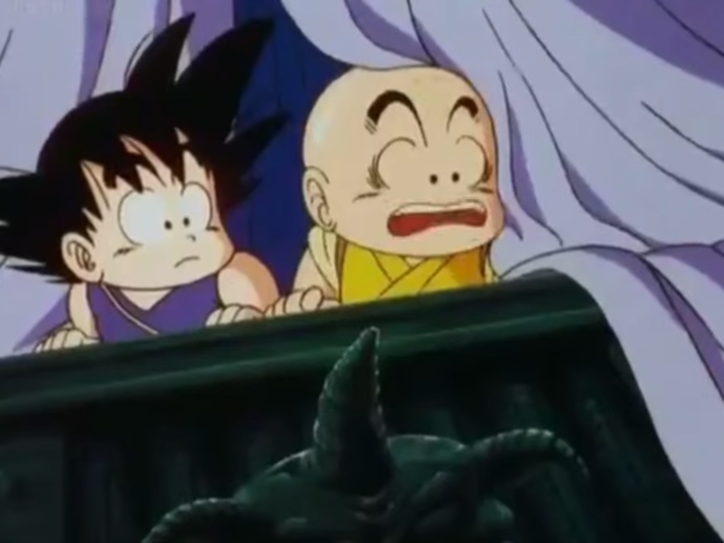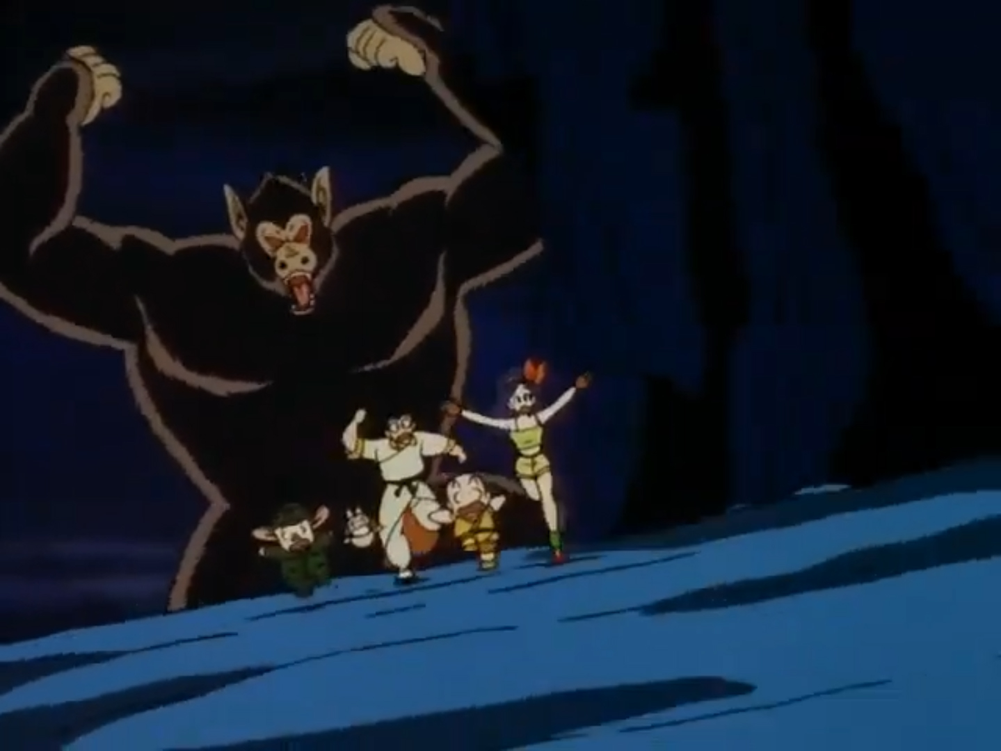 Goku looks up at the full moon and turns into an Oozaru, breaking the rock wall and freeing everyone but also then chasing them in a crazed rage until Puar cuts his tail by changing into a giant part of scissors. Goku shrugs off the whole no tail thing and puts on Oolong overalls, so basically adapting the final piece of the first story arc the previous film missed off (I knew I remembered it somewhere!)