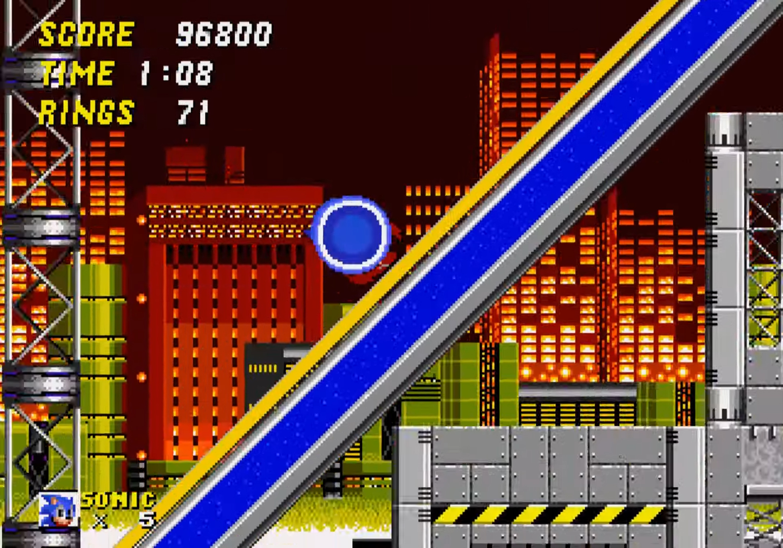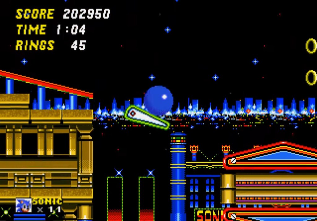Sonic begins his long-term relationship with massive pinball machine bumpers.