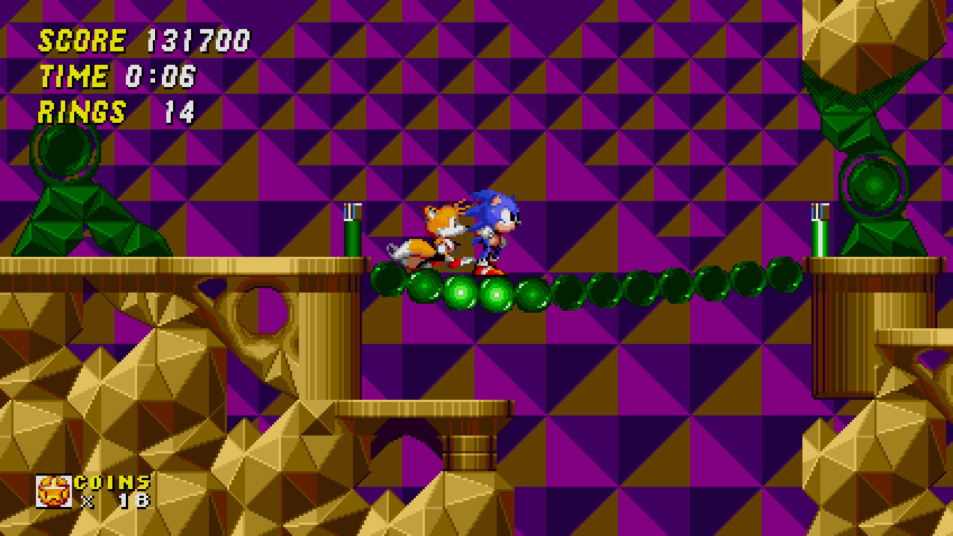 A not-quite-as-iconic opening level, but still: Sonic and Tails! … With Tails eclipsed by Sonic, which is fitting I guess…