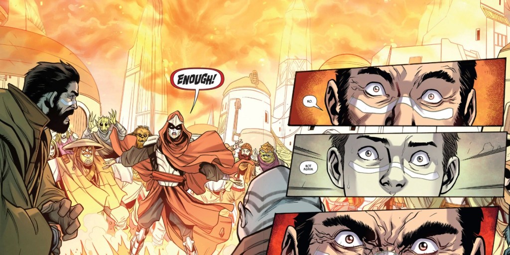 The story focuses mainly on two characters, the first of which is Jedi Vildar Mac, who comes to Jedha after he has a nightmare based on when he was 4 and he saw his entire home village destroyed by a Sorcerer of the Tund (a Darkside-aligned cult) so he wanted to clear his mind, and Jedha was the place to do just that. He’s shocked however at just how many Force-using groups and cults (plus the very anti-Force-using cult The Path of the Open Hand) have great destain for the Jedi, though Padawan Matthea Cathley, who has been on Jedha for some time, explains that its been that way for as long as she’s been here. The two are soon brought to the Shrine of Sarrav where they’re told there has been a theft and the various different Force groups are blaming the other. This doesn’t last long as soon Vildar is freaking out at the sight of a Sorcerer of the Tund he sees on the street before giving chase to our second of the two main characters: a thief called Tey Sirrek.