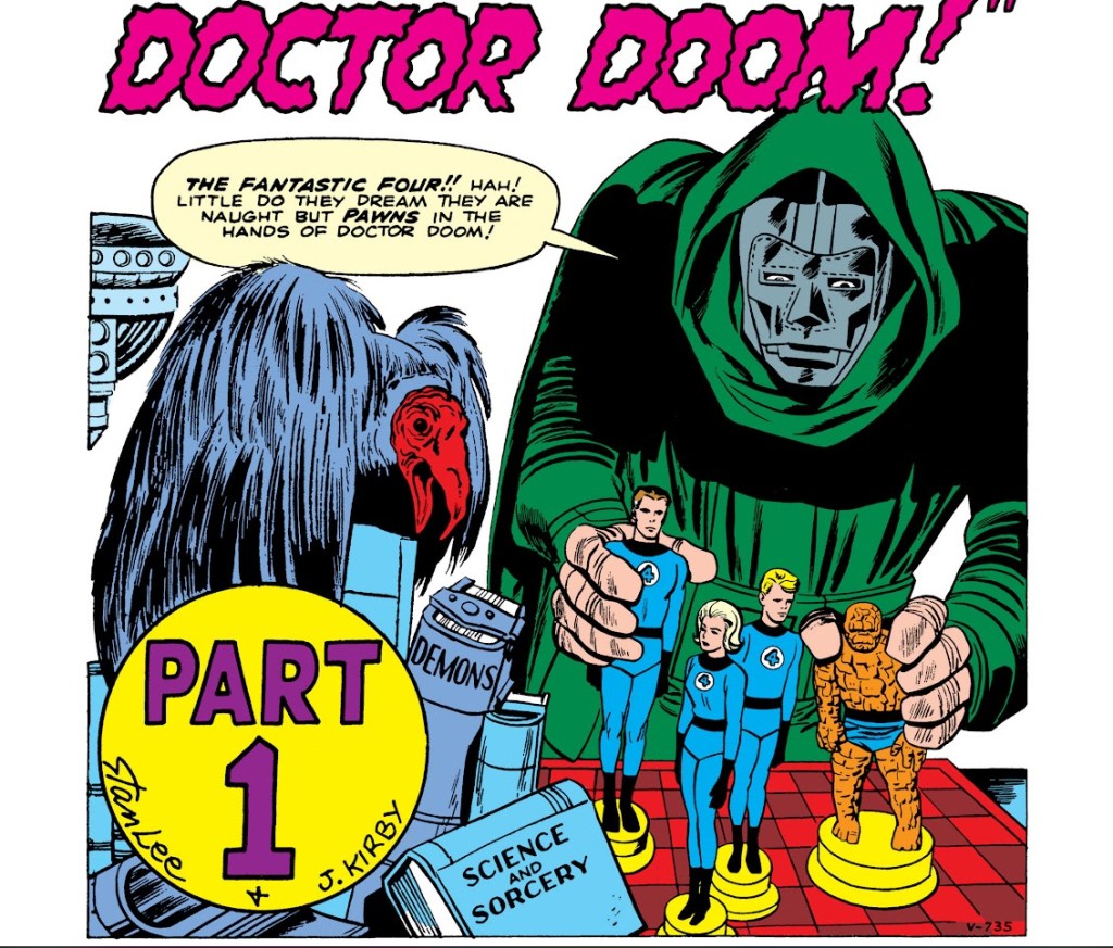The debut panel of Doctor Doom, complete with chess pieces of the Fantastic Four and a book of “Science and Sorcery”… yeah, that about sums his character up…