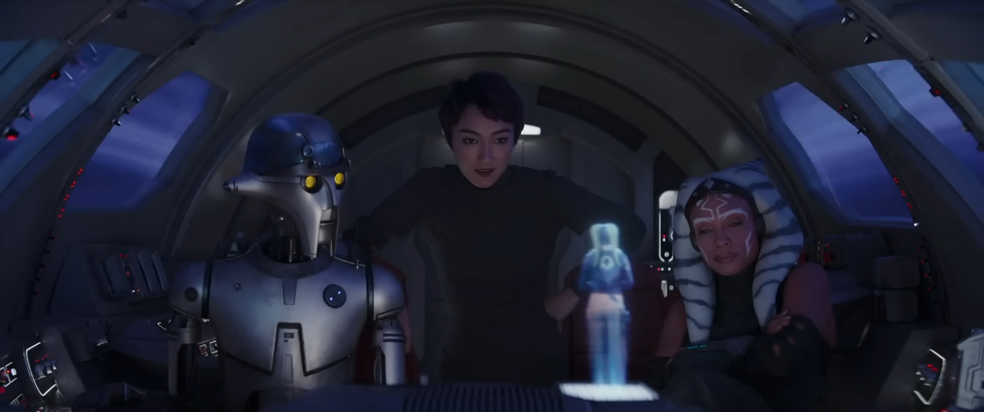 Rebels ended with lead protagonist Ezra Bridger and the Imperial Grand Admiral Thrawn (voiced by Lars Mikkelsen) being whisked away by Force sensitive space whales, leaving Ezra’s friends and allies deciding to head out to find him post-war. That’s where we pick the story up from but not before putting on the breaks and trying to catch up non-animation fans with the plot and characters. Thanks to the Mandalorian most are familiar with Ahsoka herself (played by Rosario Dawson) but she is now travelling with the ancient Jedi lightsabre constructing droid Huyang (voiced by David Tennant, as he did in the Clone Wars cartoon) and we soon hear that Rebels character Sabine Wren (Natasha Liu Bordizzo) underwent Jedi training with Ahsoka at some point but it didn’t work out and the two split. We then see Sabine is living in Ezra’s old place and watching old messages from him but when Ahsoka finds some new information about his whereabouts the two reunite.