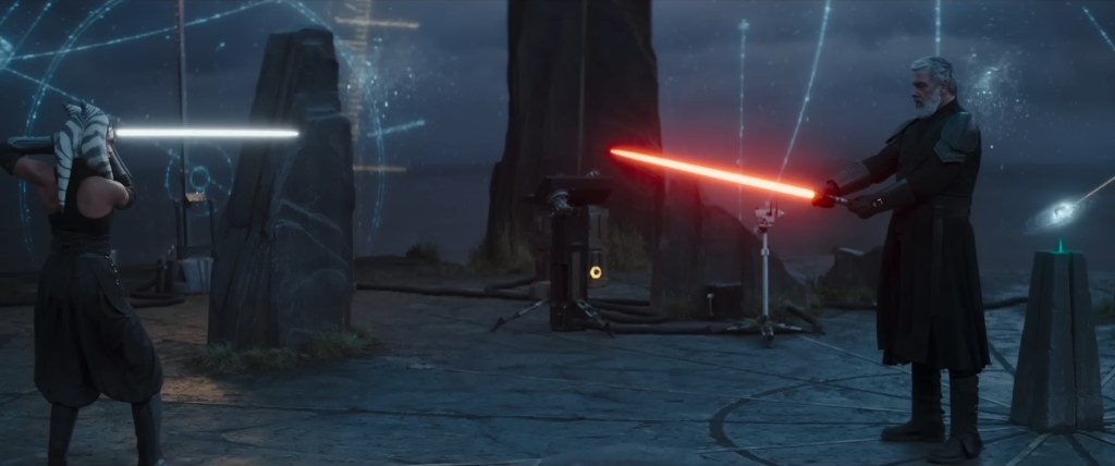 This is where we’re introduced to the main threat of the first half of the series as the returning Nightsister of Dathomir Morgan Elsbeth (Diana Lee Inosanto) is rescued from imprisonment by two lightsabre-wielding Jedi-like people called Baylan Skoll (Ray Stevenson) and Shin Hati (Ivanna Sakhno) I will say this right now that Stevenson’s Baylan is without a doubt the best and most interesting thing about the series and I’m really gutted that he passed away as the character had so much more to give and he was so damn good in the role. Ah well, nothing anyone can do about it now… So anyway, they are also on the trail of Ezra but not for him instead they’re after Thrawn. Well, Morgan is after Thrawn, Baylan and Shin seem to have their own agenda. After the two sides have a few lightsabre skirmishes we find out that a map pointing to where the duo are shows that they’re in another galaxy altogether and the planet where the map works sets the group for a big showdown half way through the series.