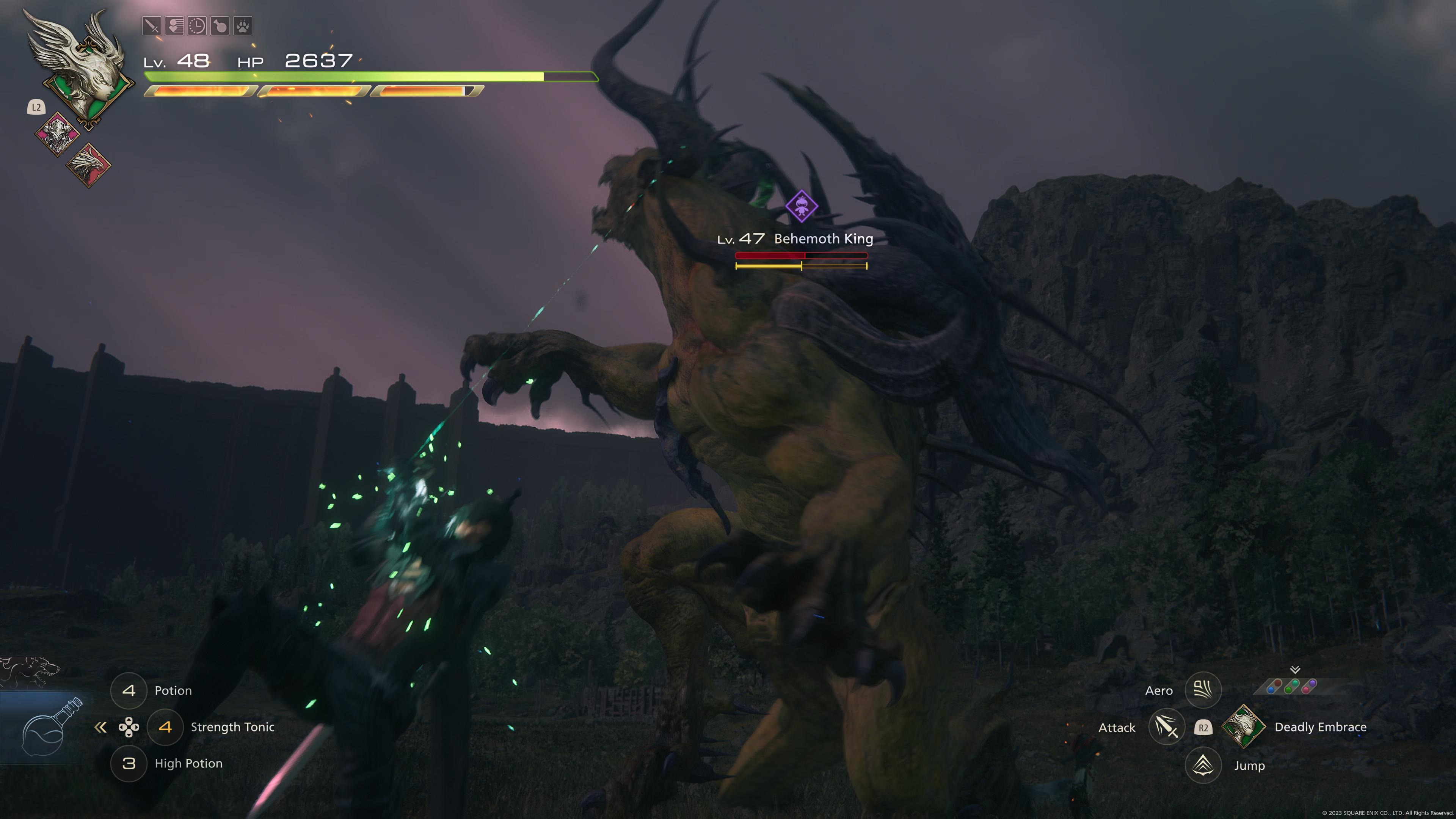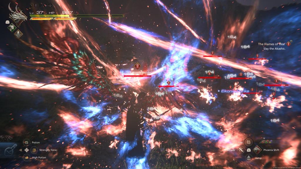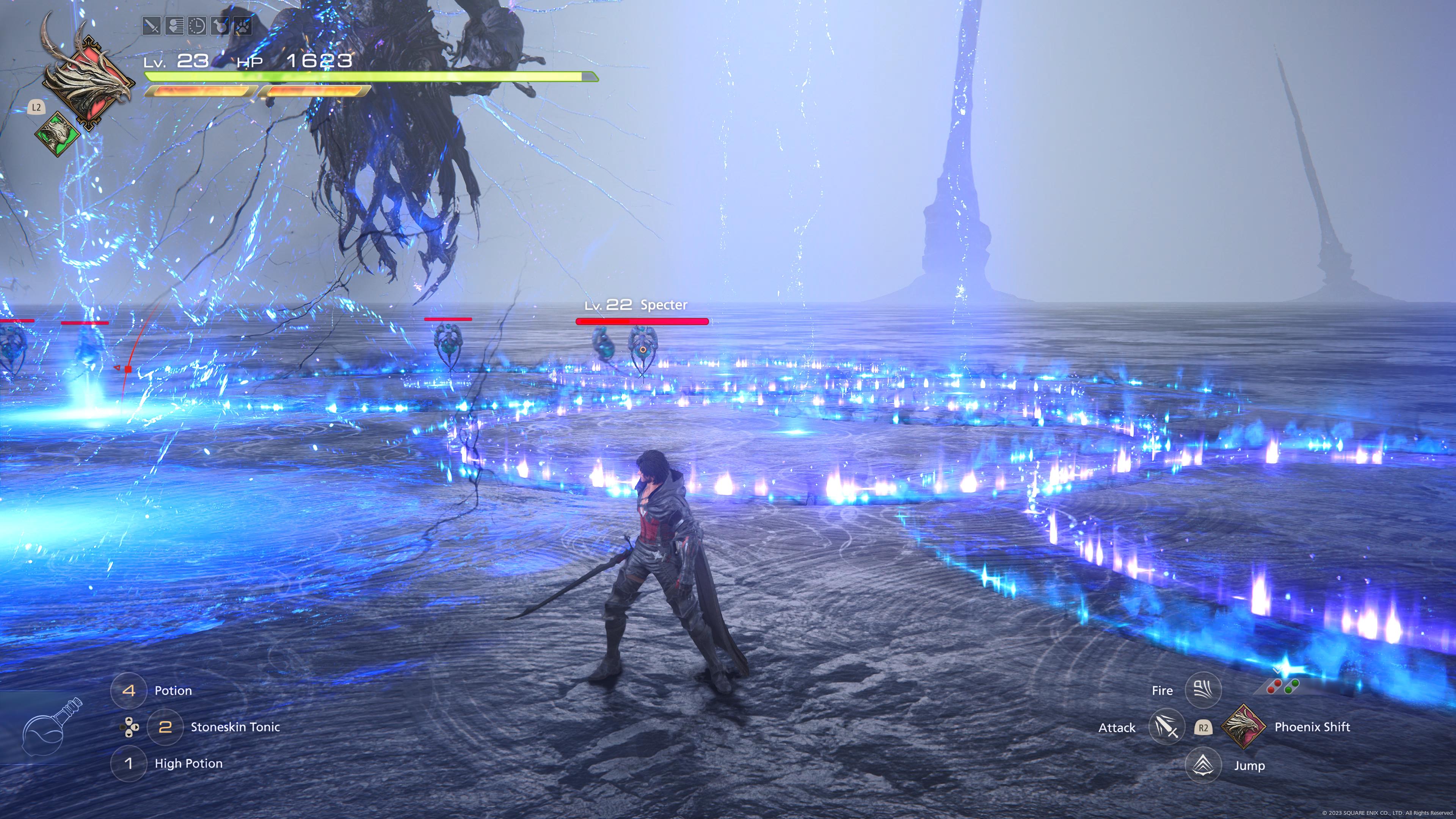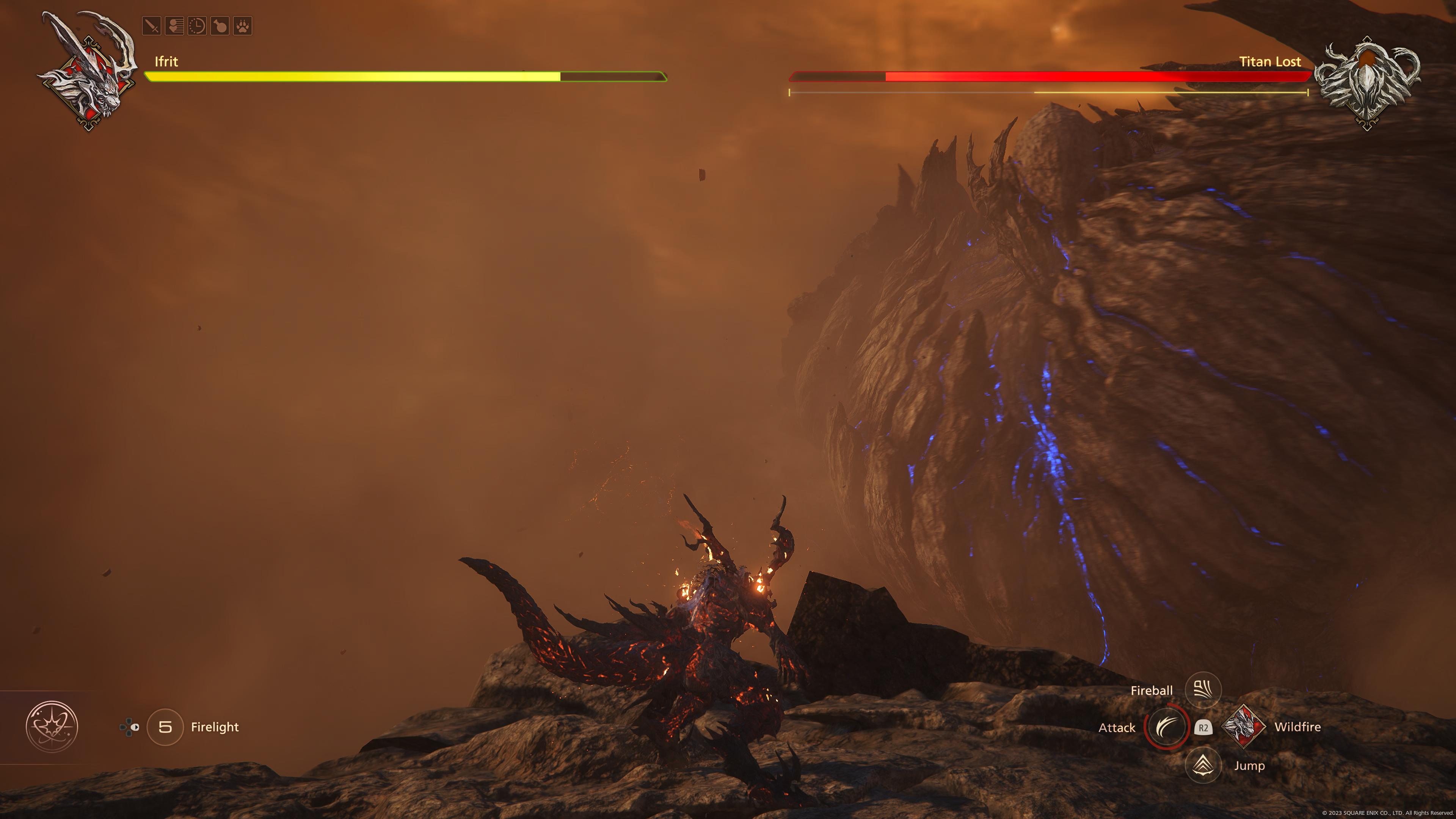Speaking of epic fights with large bosses another key part of the game is Eikon Battles, where you fully transform into Ifrit and have to fight one of the other Eikons in a Godzilla-style showdown. These are normally half a fight like the regular battles (but with Ifrit’s moveset) and half cutscenes with occasionally entirely pointless QTE prompts. Now I thought about 10 years ago everyone agreed that QTEs were completely pointless and stopped them, you know have me watch a big cutscene or have me fight, no point in having me watch a cutscene but suddenly have to press a button otherwise I take damage or at worse have to watch the cutscene again. Luckily FFXVI’s QTE give you so much time to press the required button that it becomes even more pointless because it’s impossible to fail them (unless your really bad at tapping Square anyway) so I just don’t understand, some of these cutscene battles left me breathless due to how full of energy and action they are back with an epic soundtrack, having to press R1 within six seconds really didn’t add anything… Still, they were often good fun overall, it just felt oddly old fashioned to see QTEs return like that. I also have to mention that status effects aren’t a thing either, so you’ll get hit by poisonous breath or the classic “Doom” spell by iconic FF enemies but all you’ll do is take damage and fall over. It’s a really weird decision because losing health via timed poison damage and being able to stop it with an antidote potion would fit very easily with this gameplay style (see: Final Fantasy VII: Remake) but hey-ho.