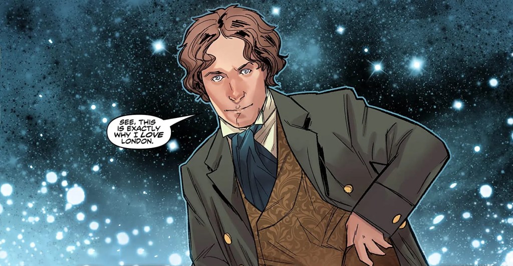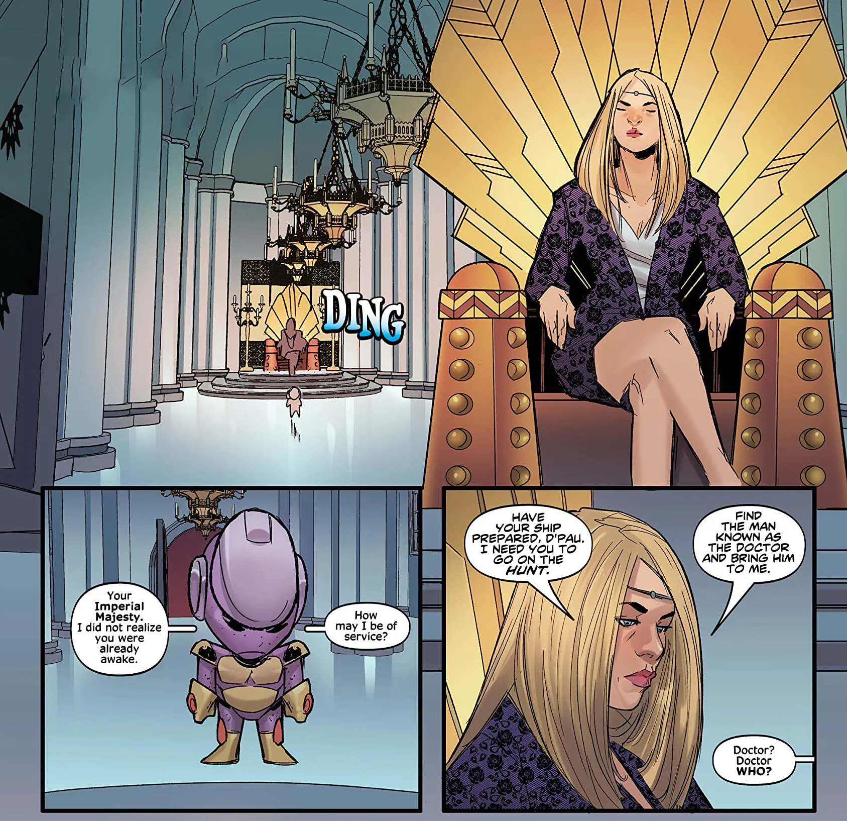 As mentioned the “Empress Rose” comes from the previous Titan Comics crossover “Alternating Current” featuring the Tenth and Thirteenth Doctors, while the other Rose is living a blissful life with a daughter and her human Tenth Doctor as seen in Tenth Doctor TV story “Journey’s End”… well, the human Tenth Doctor heading off with Rose was seen in that story, the whole daughter thing is new…