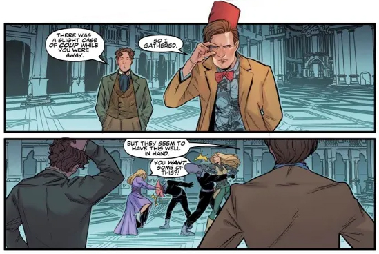 The Eleventh Doctor is post Amy and Rory but has yet to hide himself away in Victorian London as seen in “The Snowmen”, whereas the Eighth Doctor is visually a mess, looking like a mish-mash of the “Night of the Doctor” Time War outfit and his original “TV Movie” clothes so combined with his ever-changing hair length I have no idea where this might be in his timeline…