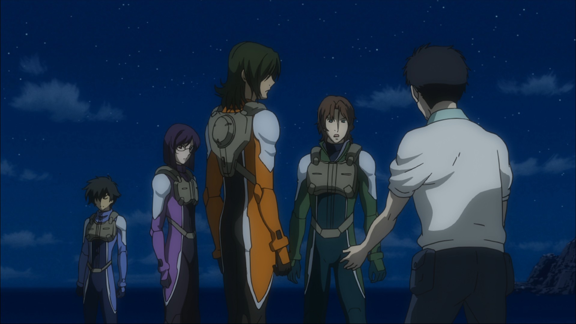 The four helpfully colour-coded Gundam Meisters having a friendly chinwag (plus engineer guy I can’t remember the name of).
