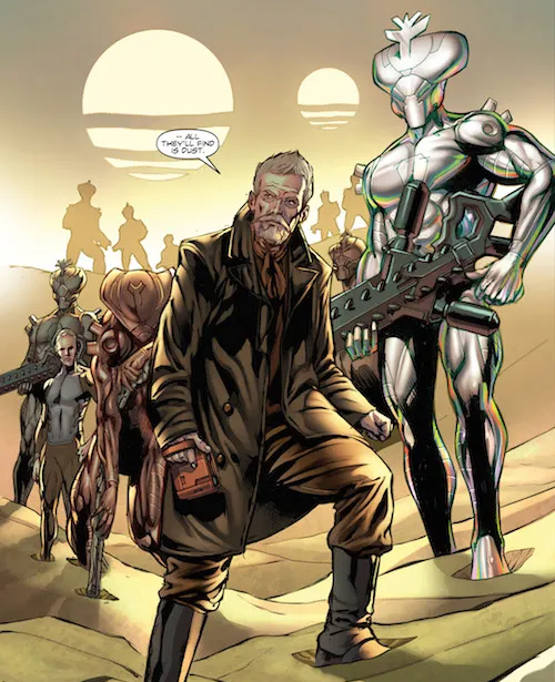 The choices are a timeline where the Tenth Doctor lets Wilf die in the radiation chamber rather than sacrificing himself and ends up a heartless dictator (or the “Time Lord Victorious” before that was a multi-media event), a timeline where the Eleventh Doctor decides to stay with River in a the “all of time happening at once” timeline instead of fixing the universe, and one where the Twelfth Doctor has gone somewhat crazy with loneliness after he believes Clara had betrayed him. Given one leads to them being assassinated as a tyrant and the other means the end of the universe they choose lonely beardy Twelfth Doctor timeline. The somewhat crazy Twelfth Doctor agrees to take them all home (and is delighted Clara has “come back”) but he soon reveals they’re in a pocket dimension linked to the Continuity Bomb and leads them out to take readings, only to reveal they’re in a city where the highly advanced Voord of Marinus have been hiding and that this Twelfth Doctor is their leader…