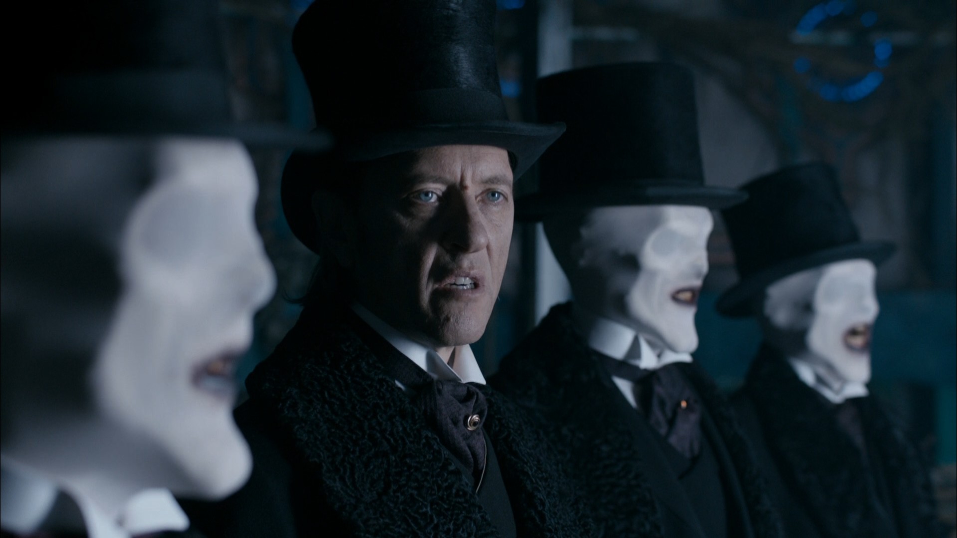 The story actually opens up with a pre-credit sequence where we see seemingly Clara (Jenna Coleman) on Gallifrey talking to the First Doctor as he’s about to steal the TARDIS and head off on his adventures, following by seeing her falling through a vortex intercut with her being digitally edited into classic era Doctor Who episodes or with actors quickly walking past in classic era Doctor costumes with their faces obscured. It’s good fun though I remember getting a bit annoyed that they used unrestored footage for the classic era shots rather than the restored DVD footage, but ah well. Also interested in seeing what adventure the Eighth Doctor and the Second Doctor (in his massive fur coat) got up to in a sunny beachside, but there you go. Anyway, the actual episode starts with Madame Vastra (Neve McIntosh) meeting an insane inmate who knows about The Doctor and speaks a rhyme that implies his death so she uses a type of candle that when burned somehow not only connects her with Jenny (Catrin Stewart) and Strax (Dan Starkey) but also River Song (Alex Kingston) and Clara, despite there being many, many years between them all. It’s one of those things I think Steven Moffatt just wrote so they can all talk and doesn’t want us to actually stop and think about it…