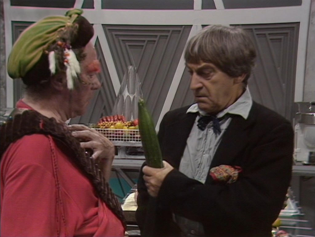 The story starts off with The Second Doctor (Patrick Troughton) and Jamie (Frazer Hines) in a black and white scene on the TARDIS that slowly fades into colour (nice touch!) and The Doctor explains that they left Victoria behind to study graphology but will be back to get her eventually and that the Time Lords have sent them on a diplomatic mission (bloody hell, no wonder fans had to create “Season 6B” to cover all of that nonsense!) They arrive on a space station kitchen and meet the rather unpleasant cook Shockeye (John Stratton), who is a Androgum, basically a humanoid-looking species that have very animal-like base instincts, and after the cook asks for but is denied permission to eat Jamie our time travelling duo head to the office of top scientist Dastari (Laurence Payne). At the meeting The Doctor reveals he’s there to put a stop to the time experiments going on in the station and is unimpressed by his prize experiment: a Androgum called Chessene (Jacqueline Pearce) who has been augmented and forcefully evolved to “mega-genius levels”, changing her appearance to a flat-out human in the process. The Doctor claims no matter what he’s done he won’t be able to stop her base Androgum instincts. As this is happening Chessene allows a Sontaran battlecruiser to dock with the ship and the station is soon overran as The Doctor tells Jamie to run.
