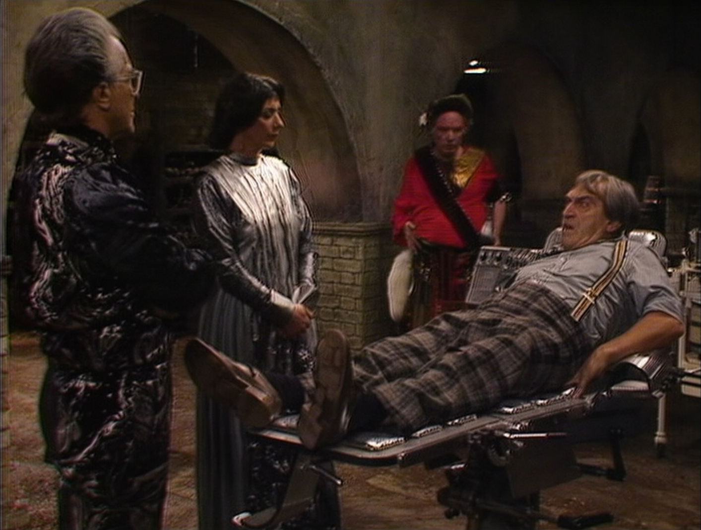 As The Doctor and Jamie escape Stike in the cellar (by Jamie stabbing him in the leg!) they have no time to rescue the Second Doctor and flee, leaving him at his captors’ mercy. Chessene hears about the “second Time Lord” and decides to go to plan B: implant Androgum genetic material into the Second Doctor so she can control him directly and then kill the Sontarans and everyone else who tries to interfere. Simple enough! At the same time the recovering Stike tells his men that he’ll soon gain control of the time machine and that they are to prepare the ship for self-destruction so there can be no witnesses. Peri is saved from the butchers knife as Chessene calls Shockeye away to unwillingly donate his genetic material to the Doctor, which he does, complete with giving the Time Lord weird ginger eyebrows like him. To further her plan Chessene also throws “coronic acid” at the Sontarans melting one completely and badly injuring Stike, but while this is going on Shockeye and the now half-Androgum Second Doctor head out to the town to eat local food.