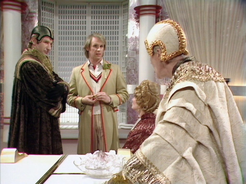 The Third Doctor and Sarah’s trip to the Tower, which they enter through the top, has them encounter Cybermen (making this the only on-screen Third Doctor / Cybermen encounter) and a “Raston Warrior Robot”, which is an all-metal humanoid that moves faster than light and fires spears from its hands. No idea where this design came from (or what is artfully jumps in the air before moving) but I always liked it, plus seeing it destroy a whole squad of Cybermen is good fun. The Second Doctor and Brigadier enter from underneath the tower and encounter a robotic Yeti in a cave, carefully lit so you can’t see its deteriorating costume but a fun cameo nonetheless. The First Doctor and Tegan make their way to the front door of the tower with little issue while Susan and Turlough stay behind in the TARDIS and watch Cybermen plant a massive bomb outside the time and space machine via the TARDIS screen; The Master allies himself with the Cybermen and promise to escort them to the Tower himself; and finally the Fifth Doctor gets caught up in more Gallifreyan politics as the nameless Castellan is accused of being behind it all after “Black Scrolls” were found in his quarters and shortly afterwards he’s killed as he’s tries to flee. The Doctor in unconvinced of his guilt…