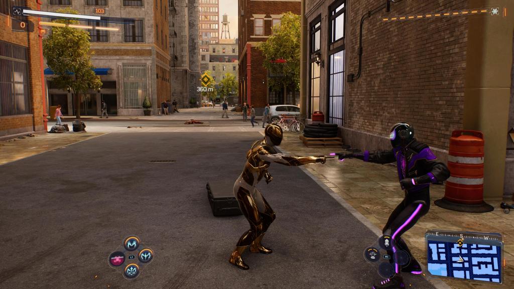 There’s lot of variety in combat as well, with standard melee combos, firing web at opponents and gadgets like a mass-web shooter, a stun machine, that sort of thing. You can parry strikes and counter, you can slide underneath them, you can air-combo them, throw them, with Miles you can zap them with electricity and with Peter in the Symbiote suit you can slam them violently into the ground. It’s all extremely smooth and varied enough that it never got boring. Much like the last game there are also moments where you can walk across the rafters and ledges and silently take people down and tie them up, but thankfully these aren’t forced stealth moments meaning if you fail you’re just thrust into another fun melee fight. Boss fights have some QTE moments but at least these weren’t as frequent as some and there weren’t any straight up cutscene QTEs, which are the worst offenders, plus some of them used the haptic feedback triggers really well, which is so often not used. As with pretty much everything nowadays there’s a skill tree to unlock things on (one for Peter, one for Miles and one for shared skills for both!), items to upgrade via collectables and unlockable cosmetics, though while the latter normally comes with an extra price the many different costumes in this game are unlocked as you level up or do specific missions, thankfully. One other fun little thing is that when you approach a randomly generated crime there’s a chance the other Spider-Man or another vigilante you meet during the story will already be there and help you, including some fun double team moves.