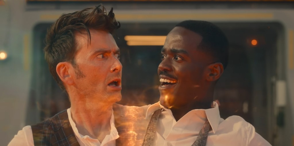 Donna and Mel run to The Doctor’s side as he regenerates, but the process stops and The Doctor asks his two companions to pull each of his arms, causing Ncuti Gatwa’s Fifteenth Doctor to pop out from the side of him. This is identified as a “Bi-generation” where the next Doctor is created but the previous one is still left alive, something “thought of as a myth”. The two Doctors separate and I have to say that as weird and out-of-nowhere as the concept is Ncuti immediately began to steal the show with his performance, so I very quickly didn’t care. The two Doctors then both challenge the Toymaker to the third round and instead of picking something where they can use their knowledge or use the fact it’s two against one to their advantage they instead pick a simple game of catch, which leads to a long “dramatic” sequence of catch which luckily for them ends with the Toymaker missing the ball, and for his prize the Fourteenth Doctor choses to banish the Toymaker forever… though his gold tooth is left behind, which is picked up by a mysterious woman while past Master laughs can be heard in an exact recreation of the very same scene from the end of “Last of the Time Lords”… that got a laugh out of me as well, I must admit!