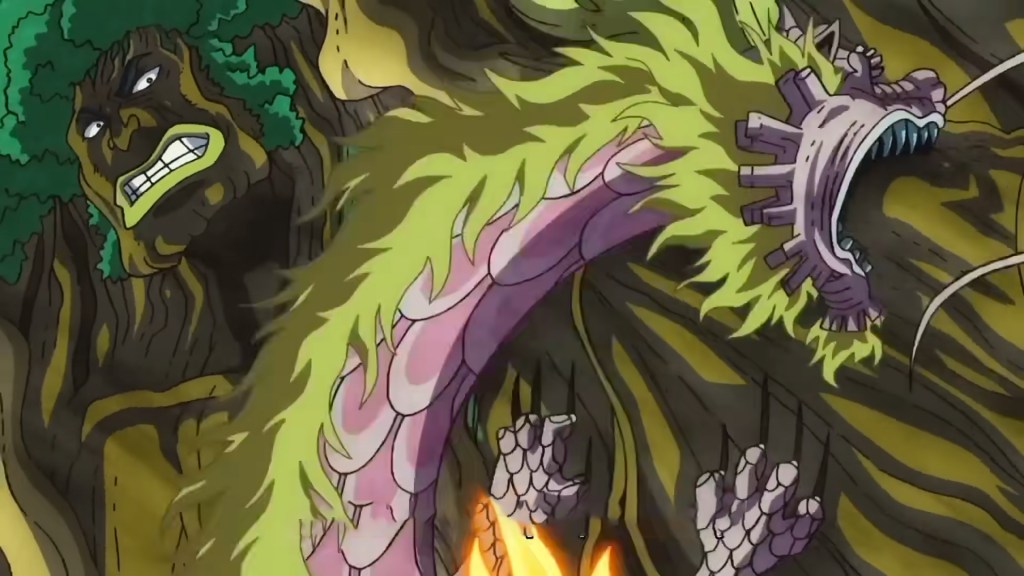 Yes we’re not quite done with the action as Admiral Ryokugyu arrives during the celebrations and begins to use his Devil Fruit power to control nature to fend off several members of the Red Scabbards, who have now resumed their role as protectors of Wano and the Shogun. Momonosuke arrives in his Dragon form and after a while lands a big fire breathing blast against his foe and believes it makes him retreat but in reality just by unsheathing his sword on a far-off shore Shanks generated enough Haki to overcome the Admiral and make him flee. A nice reminder of how over powered Shanks is!