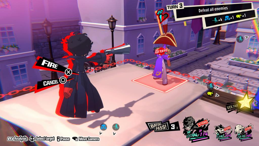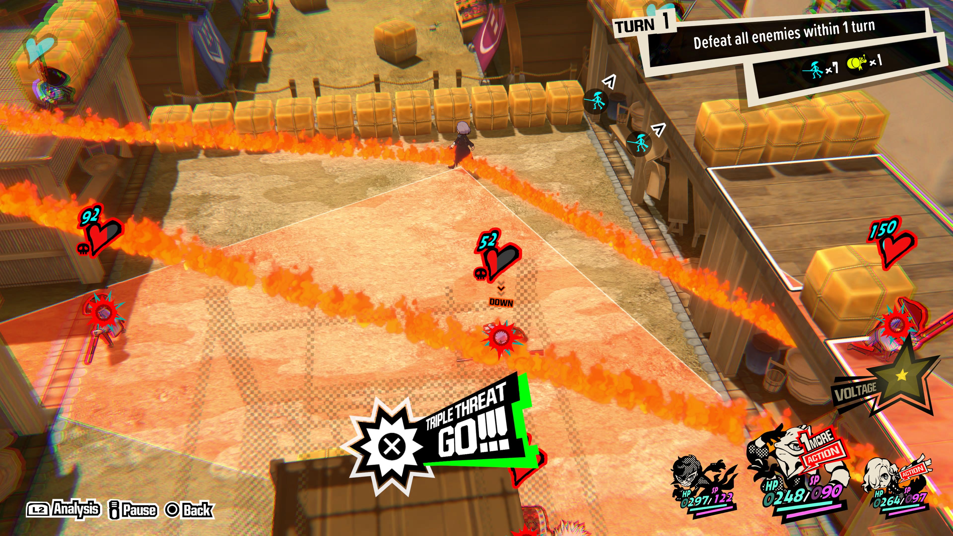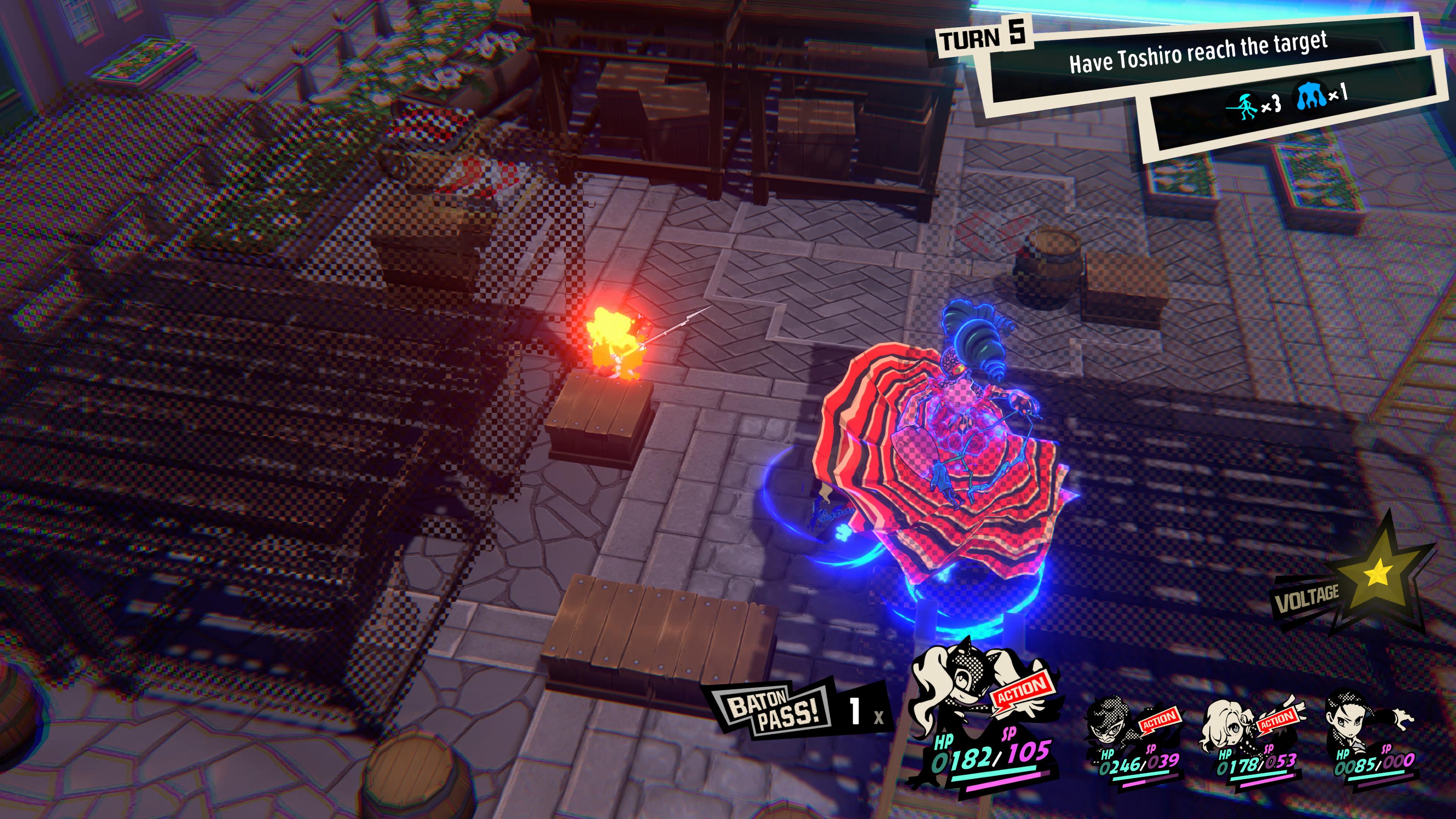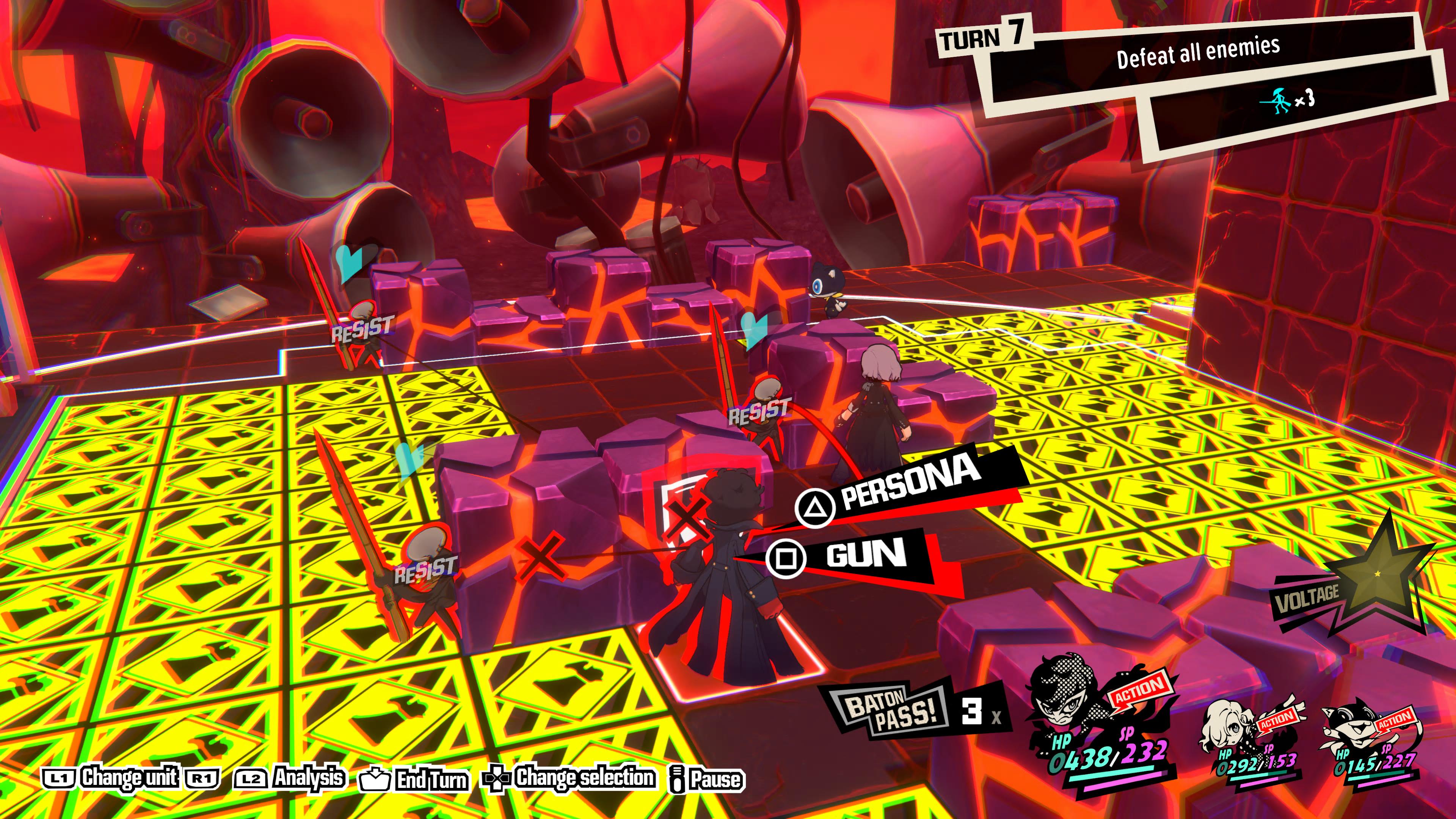 Full credit to Atlus as they did blend Persona with a Tactical RPG really well, ticking boxes in both categories. The actual gameplay is as you’d image, maps are broken up into grids where you can deploy and move three characters a certain amount of squares each turn, with your side and the enemy side taking turns moving and attacking. The Persona-ness comes in with how you can attack as much like the game you can use melee weapons, guns for long-range and summon Personas to do magic attacks and a special move, the latter of which you can only do by building up the “Voltage” meter. The magic attacks all do different effects like Psy damage making enemies move out of cover, wind sending them flying backwards, and your more standard stuff like fire, ice and electric moves stunning people or giving them ticking damage over several turns. Another Persona-ism is a “One More Turn” system, though this time it happens when you attack an enemy that isn’t behind cover, and gaining a “1 More” will allow you to do a “Triple Threat” move which is basically the “All Out Attacks” from Persona 5 but you have to create a triangle between your three party members and everything caught in the triangle will be hit by the move. Also if you knock an enemy off of a high platform and one of your team mates are underneath they get shoot the enemy as it falls for extra damage.