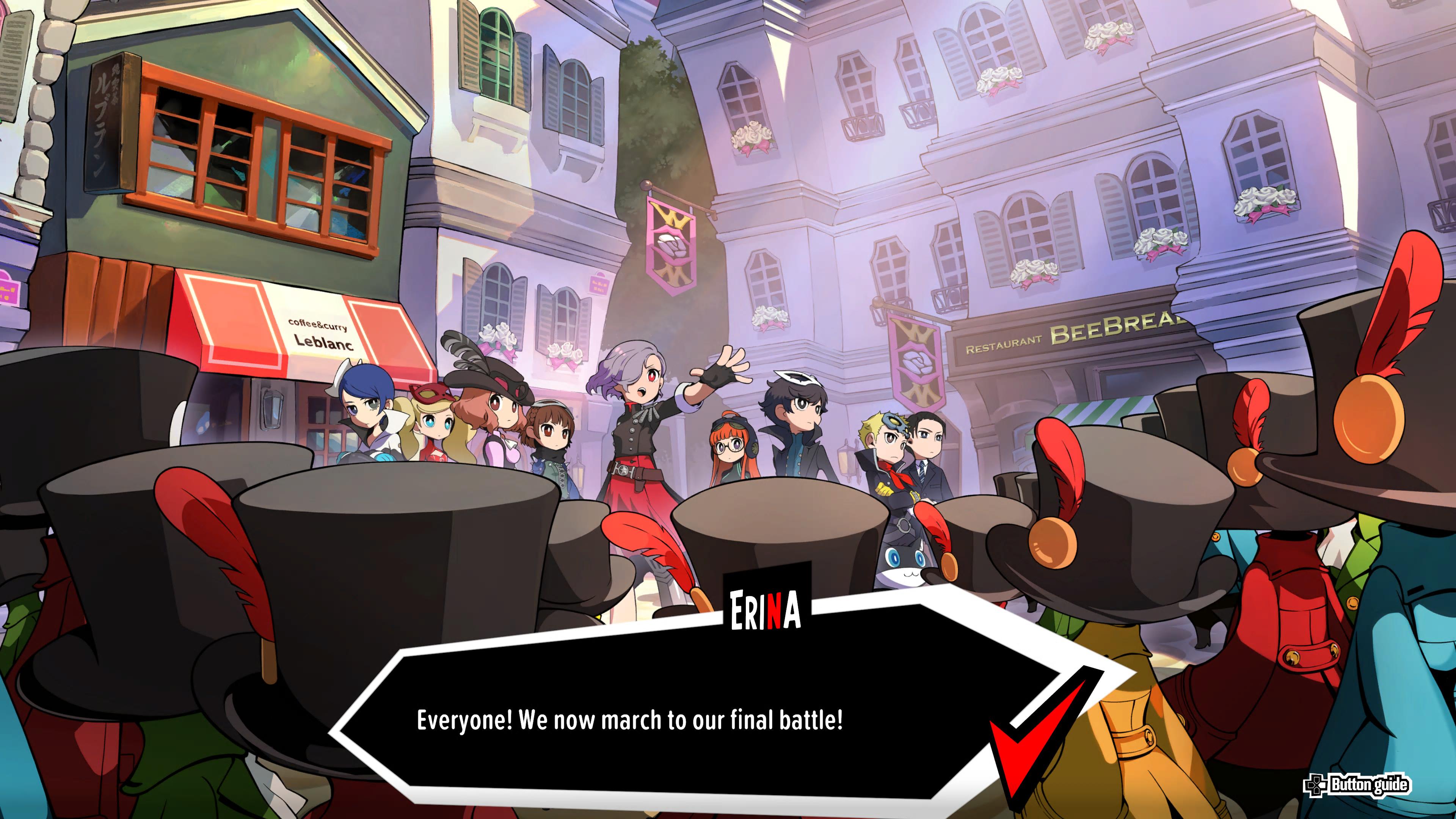 After a boss battle with the Shadow Toshiro the real Toshiro learns to stand up for himself and we find out that Erina is actually Toshiro’s Persona, called “Ernesto”, though she can switch between her human and Persona forms at will (allowing you to still use Erina in the levels!) Shadow Toshiro tries to summon a demonic form of Eri, who blames Toshiro for what happened to her, but they both get driven off. This is a Persona game though so the final boss then appears out of nowhere and is revealed to be a God made up of collective consciousness again, in this case Salmael, who wishes to bring about peace through robbing people of their will to stand up for themselves, starting with Toshiro. The Phantom Thieves plus Toshiro go through one last Kingdom (including, as mentioned, complete 1-to-1 copies of the previous three bosses…) before eventually destroying Salmael and returning to the real world. The Thieves don’t meet Toshiro but see on TV that he confessed everything and took down Marie and his father along with his own reputation, but plans on still being a politician, just an honest one. Toshiro later phones the gang and thanks them, then we get a post credits scene of Eri, walking with a cane, meeting back up with Toshiro.
