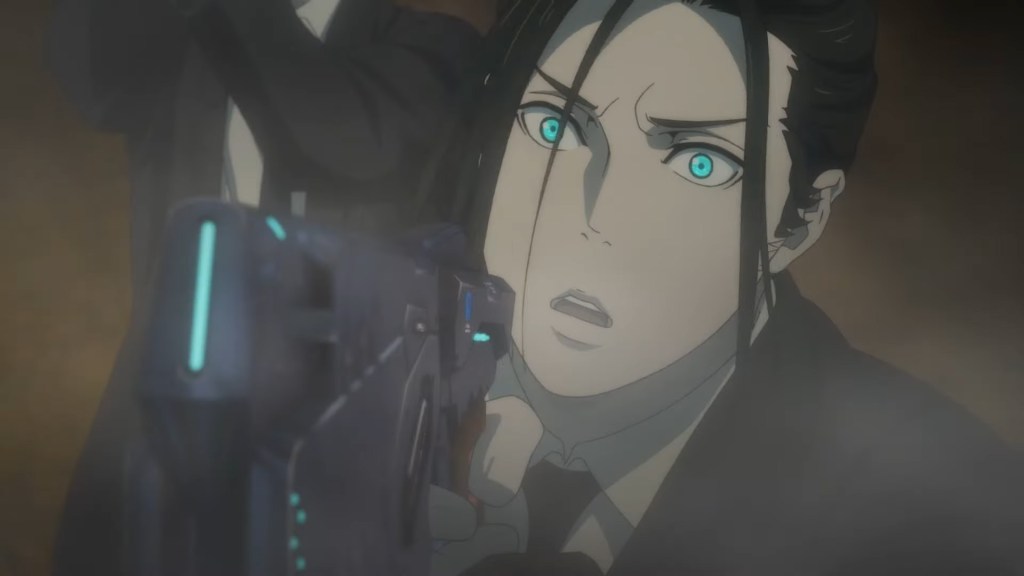 Kai is soon tracked down and it’s revealed that he’s an undercover MFA agent called Akira Vasily Ignatov and that before killing Stronskaya to keep his cover she entrusted him with the papers, papers that apparently show how Sibyl could expand to takeover foreign relations and even warfare. So yes this is Kei from Psycho-Pass 3’s brother who was mysteriously killed that was a key focus of that series, therefore it shouldn’t be a surprise that not long after that Tonami is able to use a “divider” to hack into his mind and force his body towards a helicopter on the roof so he can get his hands on the papers but Akira manages to resist control long enough for Shindo to shoot him dead. Akira pleads for Shindo to look after his brother Kei, which shouldn’t be a problem as Shindo’s son Arata is already friends with him, but Shindo uses the Stronskaya papers to make a deal with the Sibyl System: keep Arata off the books so his criminally asymptomatic son won’t be integrated into it in exchange for the papers. This leads to him to be ejected out of Bifrost and leads to him committing suicide on the day of Kei’s wedding, leading to Arata’s confusion and confrontation with Tsunemori that leads him and Kei down the path of joining the PSB and generally sets up the whole plot of Psycho-Pass 3 quite nicely.