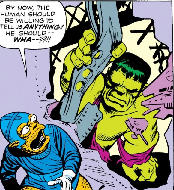 The first three parts of the first issue show Dr. Bruce Banner save the life of teenager Rick Jones when the latter wonders onto the staging area for a test explosion of the new “Gamma Bomb” Bruce and his fellow scientists created but this act of bravery ends up exposing Bruce to massive amounts of Gamma Radiation. This happened because Igor, a defector from the Soviet Union, was actually a SPY from the Soviet Union and decided not to halt the countdown of the bomb so the US would lose its top nuclear physicist. General “Thunderbolt” Ross was present at the test with his daughter Betty Ross, who is relieved when Bruce is seemingly unharmed, that is until a few hours later when he transforms into the (grey) Hulk (without her around, obviously) and goes on a rampage. Rick tries to follow him and calm him down with little success, at least until they find Igor and expose his plans, Hulk changing back to Bruce in time for Ross and co. to arrive and arrest Igor, with Betty thankful that Bruce missed “the Hulk”. Then oddly parts 4 and 5 of Issue 1 deal with a large-headed Soviet agent called “The Gargoyle” who is swiftly defeated when Bruce changes into the Hulk again, though Gargoyle actually reverts to a regular human again and commits suicide to take out his fellow Soviets in the last few panels in frankly an unexpectedly mature end to the story (well, mature for a 60s comic about a large grey man punching a man with red skin and a giant head anyway…)