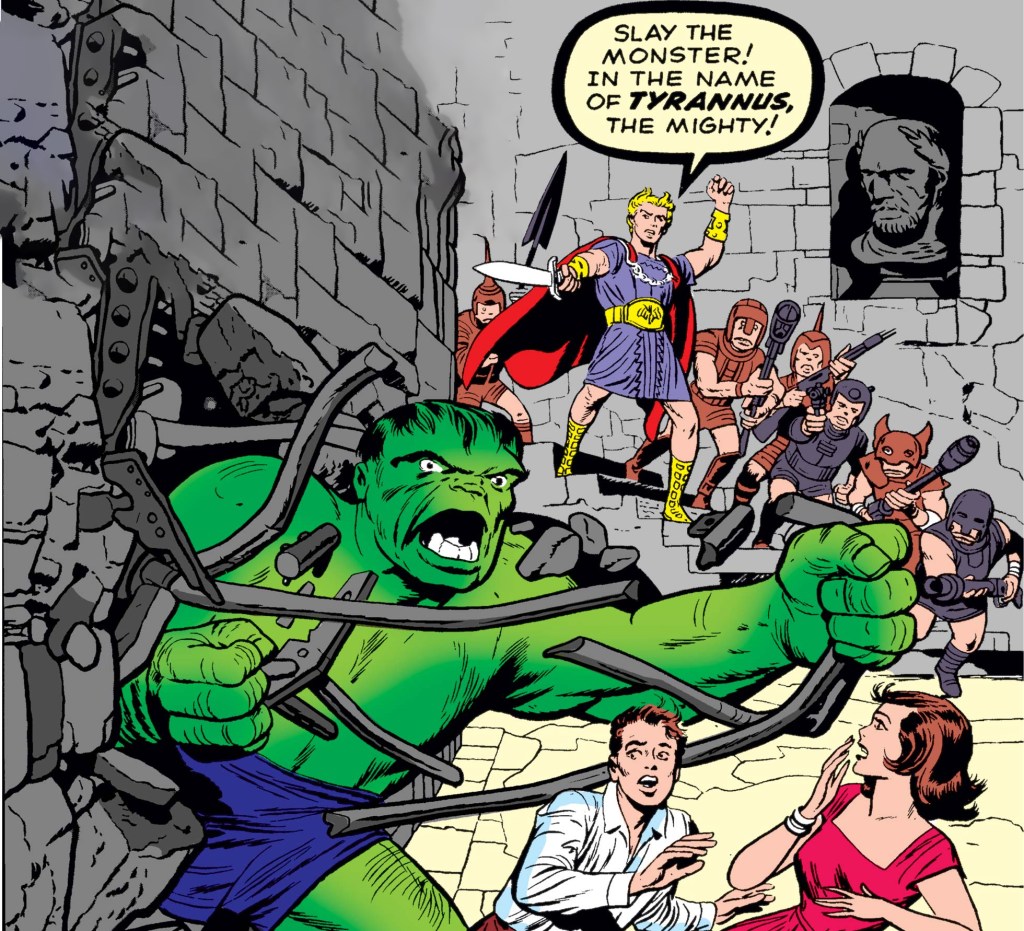 Issue 4 has Rick use his mental control over the Hulk to send him away, then send him back to him when he’s arrested and interrogated by Ross, then Hulk reverts to Banner who tries to rig a machine to give him control of the Hulk but instead just gives the Hulk rudimentary intelligence and little else. Then in the next part of the issue an alien named Mongu arrives and Bruce uses a Gamma radiation blaster to force himself to turn into the Hulk and fight Mongu only to find out that the alien was a “commie agent” from the Soviet Union in a battle suit… of course! It’s so obvious! This does at least give us the first “thunderclap” usage, if nothing else. Issue 5 has an evil… non-human person who lives deep in the Earth called Tyrannus kidnap Betty and give her father the ultimatum of “allow me to conquer America with no opposition from the US military or your daughter will be harmed!”… Yeeeeah. Not 100% sure that would succeed… doesn’t matter though as Bruce and Rick followed Betty to Tyrannus’ lair and after some good old fashioned forced gladiatorial combat Tyrannus is defeated and buried in his own base. The other half of the issue has Banner see the plight of a village called Llhasa under the thumb of “General Fang” and changes into the Hulk to defeat him, but does so BEFORE he gets on the plane, so the Hulk has to try and hide his appearance behind regular clothes… Yeah. Anyway, Hulk arrives, pretends to be a Yeti and then defeats Fang and saves the village…