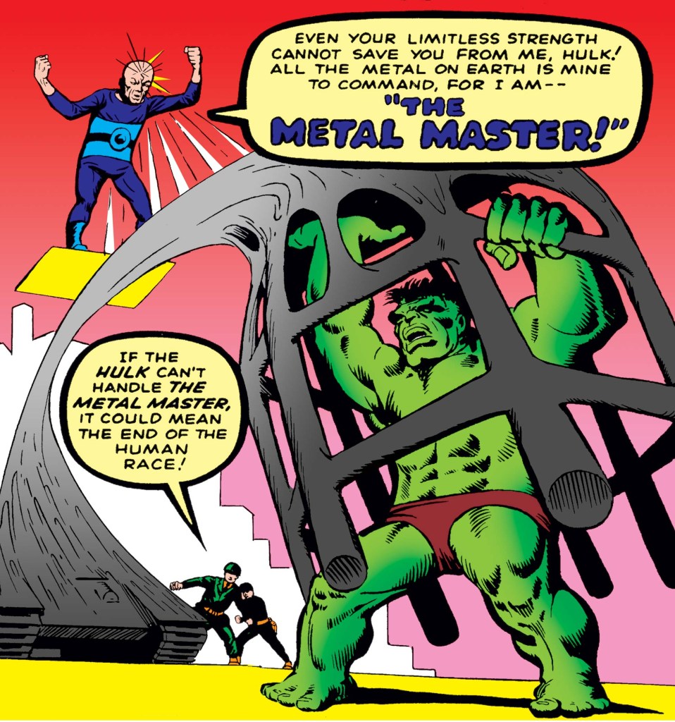The final issue then is one long story where an alien who can control metal, dubbed “The Metal Master” arrives and easily deals with the military and their metal guns and vehicles, while at the same time Hulk uses the Gamma gun to transform back into Banner but he finds his human form still muscular. In order to stop Metal Master Bruce transforms back into the Hulk but to the big green monster’s shock his head is that of Bruce so he dons a latex Hulk mask and heads off to confront the alien, but fails. Hulk, who luckily fully transformed before he’s de-masked, is captured by Ross as Metal Master causes havoc across the world and Rick Jones… *sigh* uses a ham radio to create the “Teen Brigade” to come to hero’s assistance whenever needed. Ugh, not super-exciting, especially if you’re a teen frankly… Anyway, Hulk escapes, turns back into Banner and is assisted by the Teen Brigade who bring together a bunch of items needed to create a fake rocket launcher made of non-metal substances which he then uses to lull Metal Master in close when the alien gets angry over not being able to control it and then grab him. So scared of the Hulk is Metal Master than he returns to his spaceship and buggers off, and that’s the end of that! Bruce returns to Betty and Thunderbolt, explaining his absence by saying he took a holiday to Bermuda, but now even Betty begins to worry that there might be a connection between Banner and The Hulk…