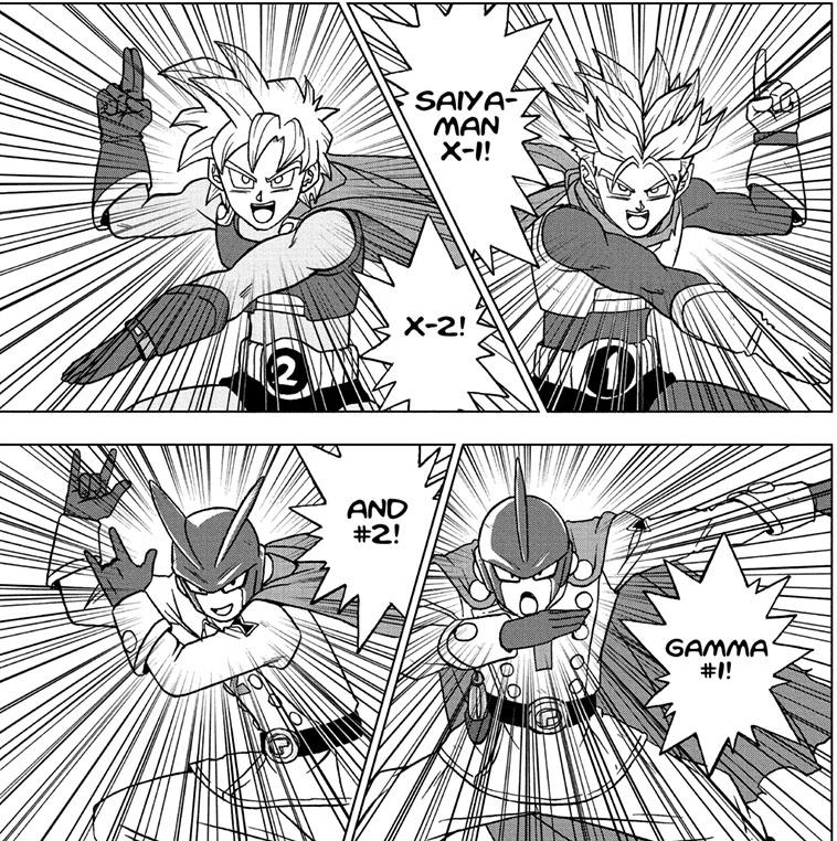 As mentioned the opening three chapters are an extra prologue to the movie focusing on Trunks and Goten “doing a Gohan” and living our their regular teenage school lives while also fighting crime in transforming super hero suits hidden in their watches, dubbing themselves “Saiyaman X-1 and X-2” though spouting dialogue based on their favourite hero franchise “Clean God”. It’s honestly a lot of fun seeing them do normal things like play computer games, hang out with their school friends (all of whom are named after school utensils like Gohan’s friends were, oddly…) and even Trunks trying to ask Mai out on a date several times was good wholesome fun, even if the mental age gap is still weird. The other half of the prologue shines a little more light on the backstory of Dr. Hedo, the man responsible for the Gamma androids and Cell Max in the film who starts off behind bars, this shows him creating the Alpha and Beta line of androids and how he winds up in prison in the first place.