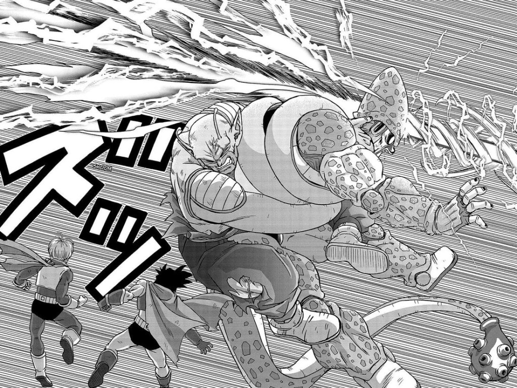Orange Piccolo (or um, black and white Piccolo I guess?) has his monster showdown with Cell Max. Got to love that artwork!