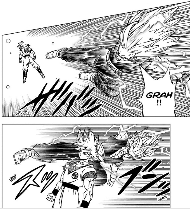 Goku (Ultra) Instinctively dodges Beast Gohan, but does later get hit when Gohan increases his power further, which takes even Beerus and Whis by surprise.