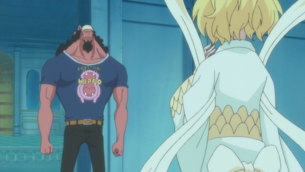 Luffy, Princess Shirahoshi, Sanji and Chopper soon reunite with Jimbei, who was actually waiting for Luffy after his promise in the previous arc, and there he begins explaining his role in sending Arlong out into the wider world, much to soon arriving Nami’s horror, plus Shirahoshi visits her mother’s gravesite for the first time. Jimbei’s revelation leads into a full on multi-episode flashback story from when Jimbei was a member of the infamous pirate group known as the Sun Pirates, under local legend Fisher Triger. A lot of the flashback is focused on King Neptune’s wife Otohime, who is extremely forgiving and kind and wishes for Fishmen and humans to coexist so they can move their Kingdom to the surface. Fisher Tiger on the other hand “heads off to the surface world for adventure” while Jimbei was serving with the Royal Army, but when Tiger returns he shows signs that his time with the humans wasn’t very fun to put it bluntly, and he soon heads to Mariejois and attacks the holy land and frees a bunch of his people from slavery, as well as others. Upon returning he is branded a hero but to the human world he is branded a dangerous criminal so to save his people he heads back to the surface to act as a pirate to make sure his actions are deemed his own rather than officially sanctioned by the Fishmen. Jimbei and Arlong are among those who join the Sun Pirates as they spend several years travelling the seas.